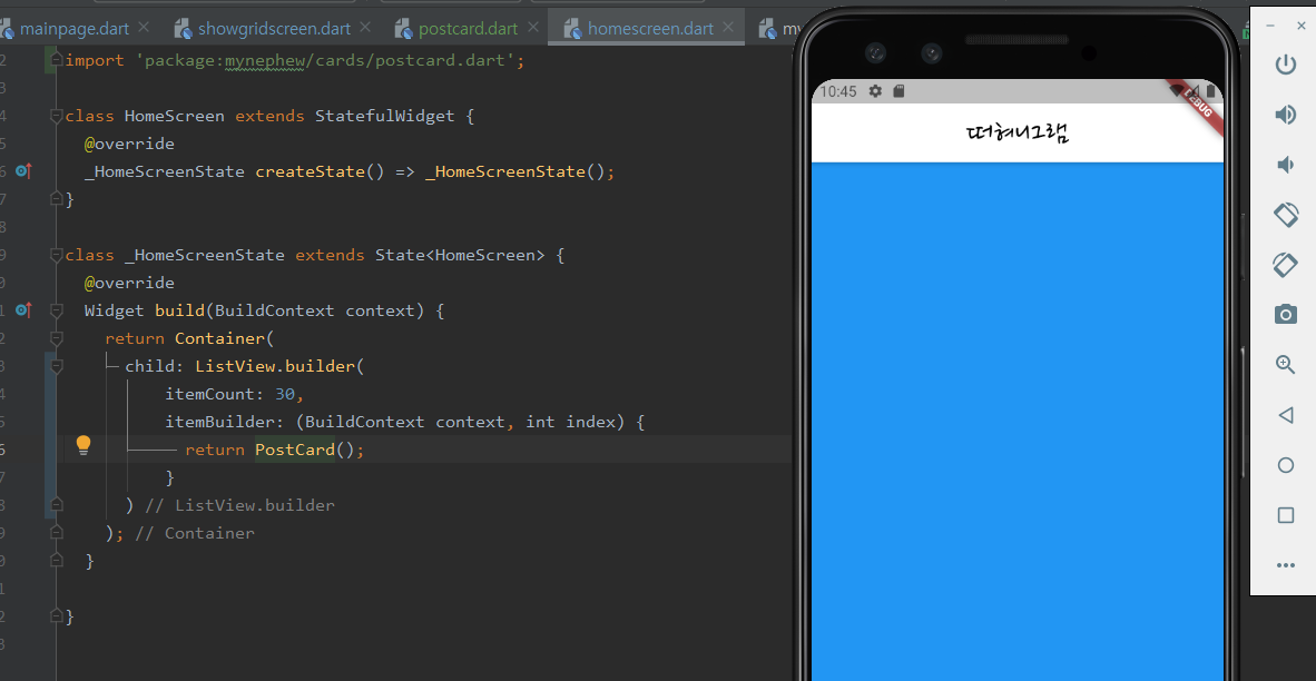 그리고 홈스크린에 return 부분에 PostCard() 위젯을 불러왔어요.