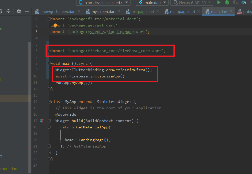 import 'package:firebase_core/firebase_core.dart'; 을 적어주세요.