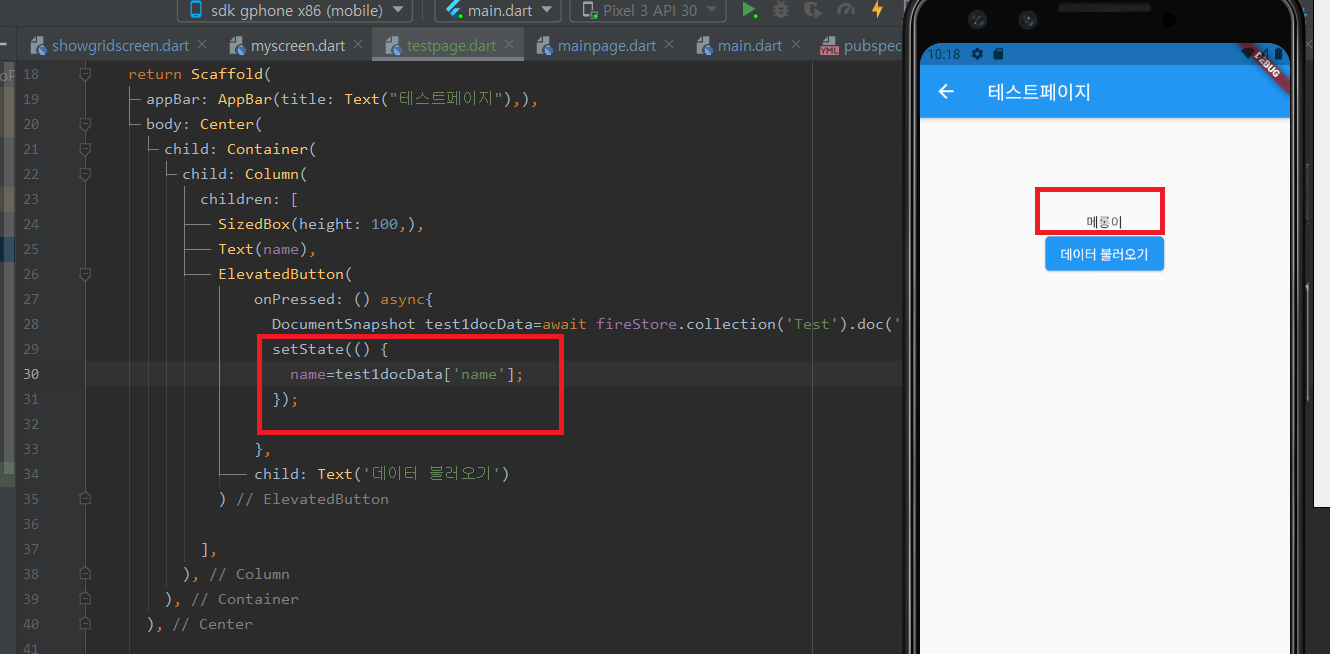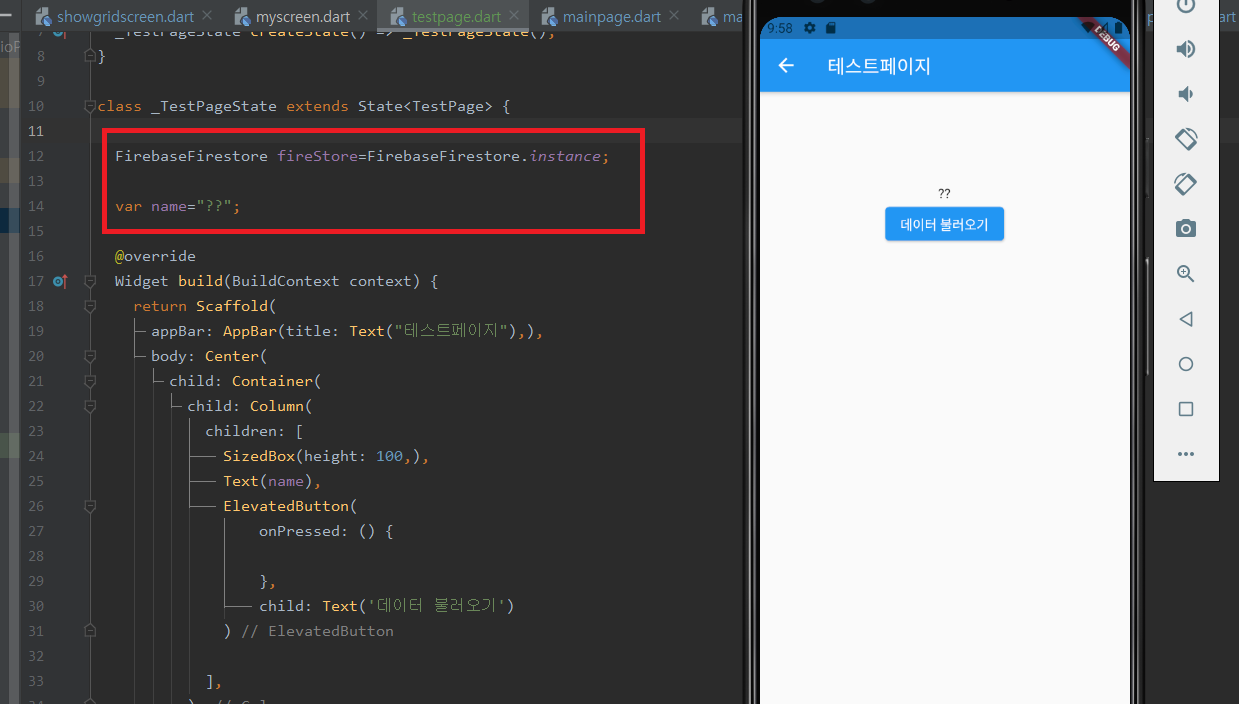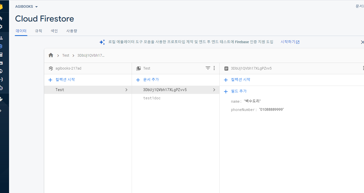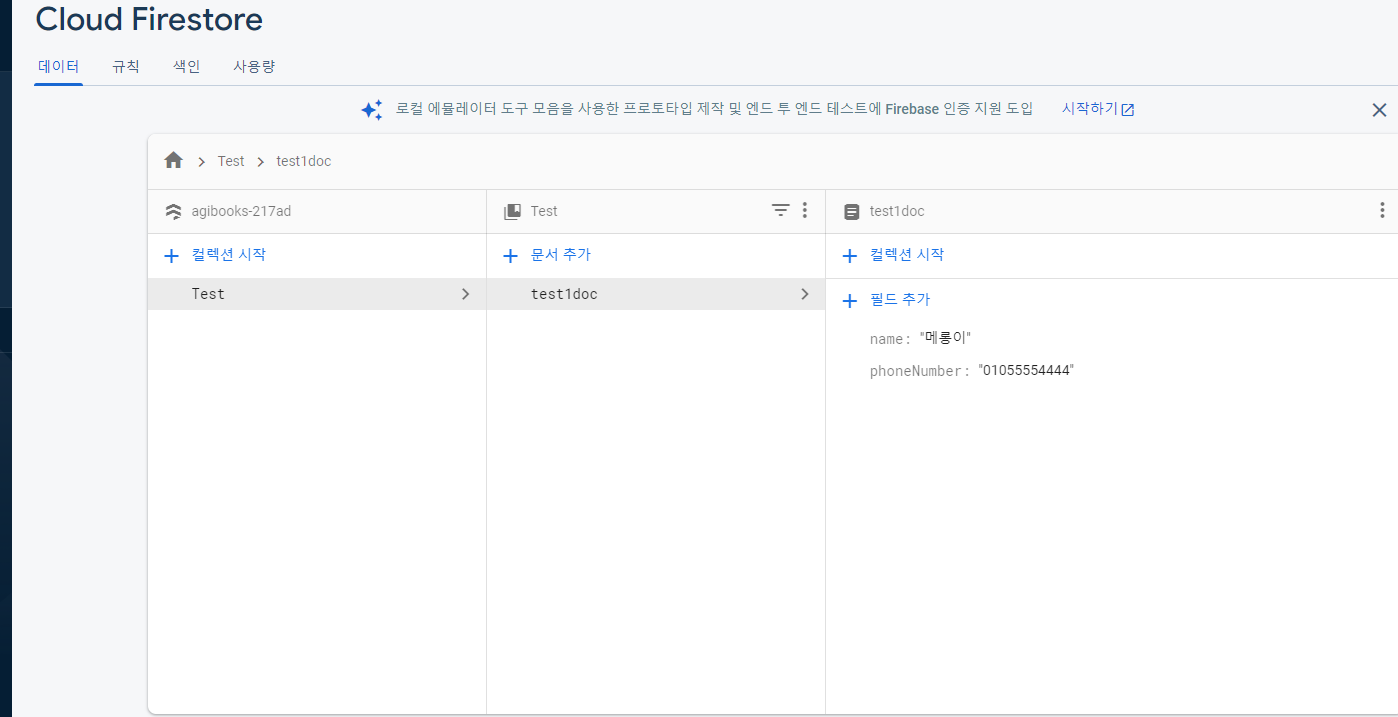 우리가 FireStore 에 Test라는 컬렉션에 test1doc 라는 문서에 name과 phoneNumber라는 필드를 생성했었는데