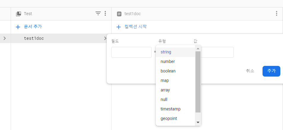 방금만든 test1doc 이라는 문서에 필드를 필드추가를 눌러 필드를 넣어주세요.