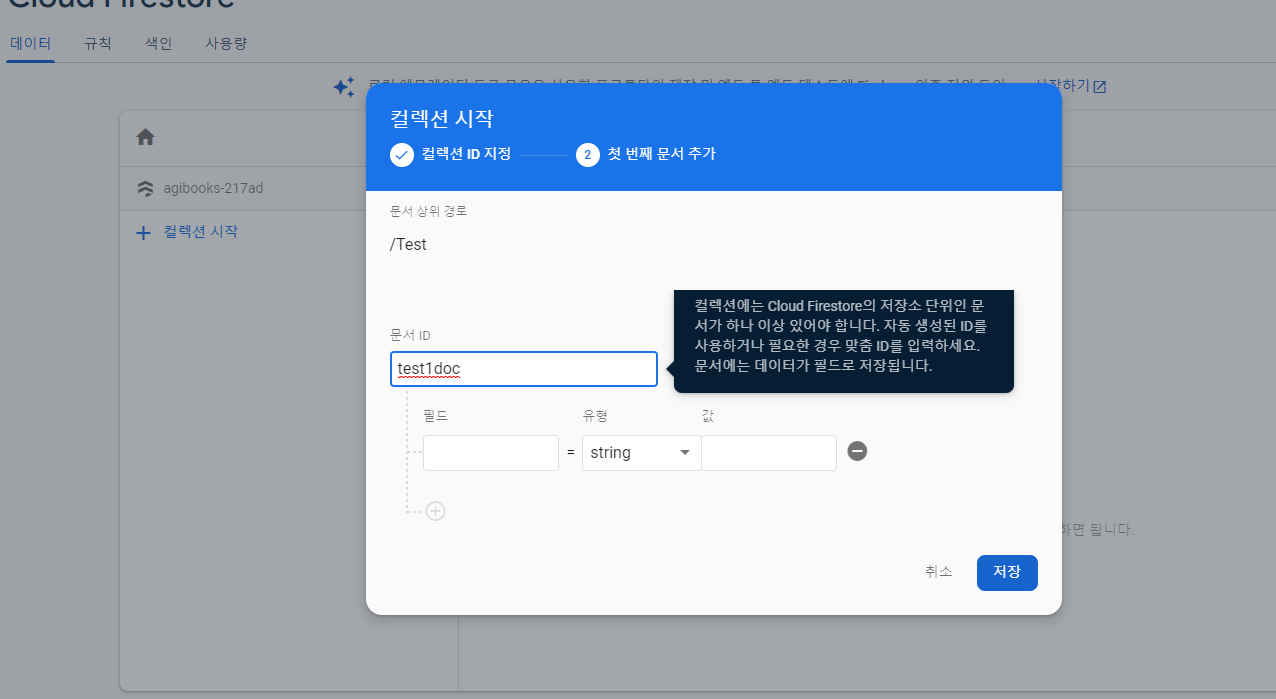 그다음 방금만든 컬렉션에 문서 이름을 지어줄거에요. 이름을 안적으면 자동으로 랜덤 16자리가 부여되요