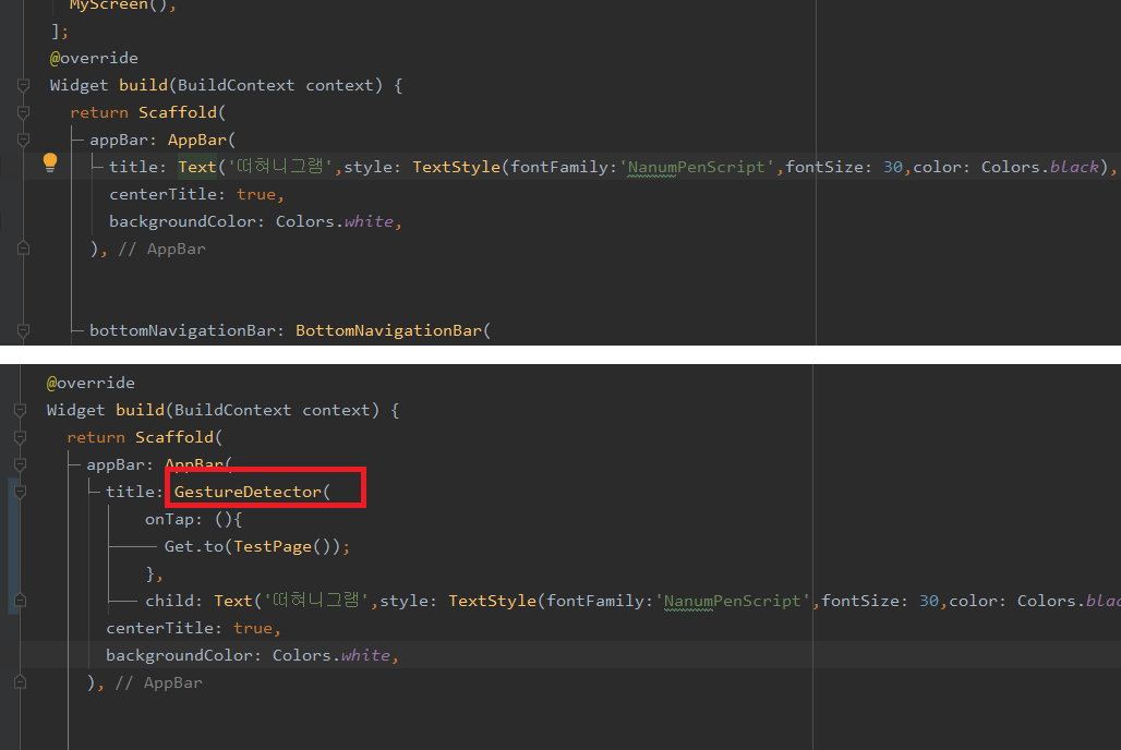 appbar title 속성의 Text를 GestureDetector 라는걸로 감싸줬어요