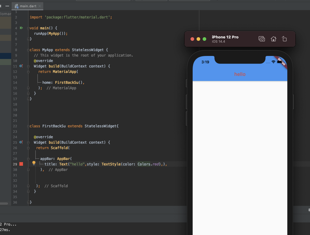 Text() 위젯안에 "" 이 따옴표안에 글씨넣으니 저렇게 hello 라는것이 반영됩니다.('text' 이렇게 한개짜리 따옴표도 가능)