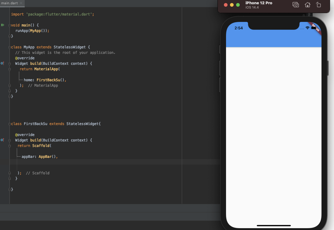 appBar 라는 옵션에 AppBar() 라는 무엇인가를 적었습니다 그러니 저렇게 파랗게 나오네요