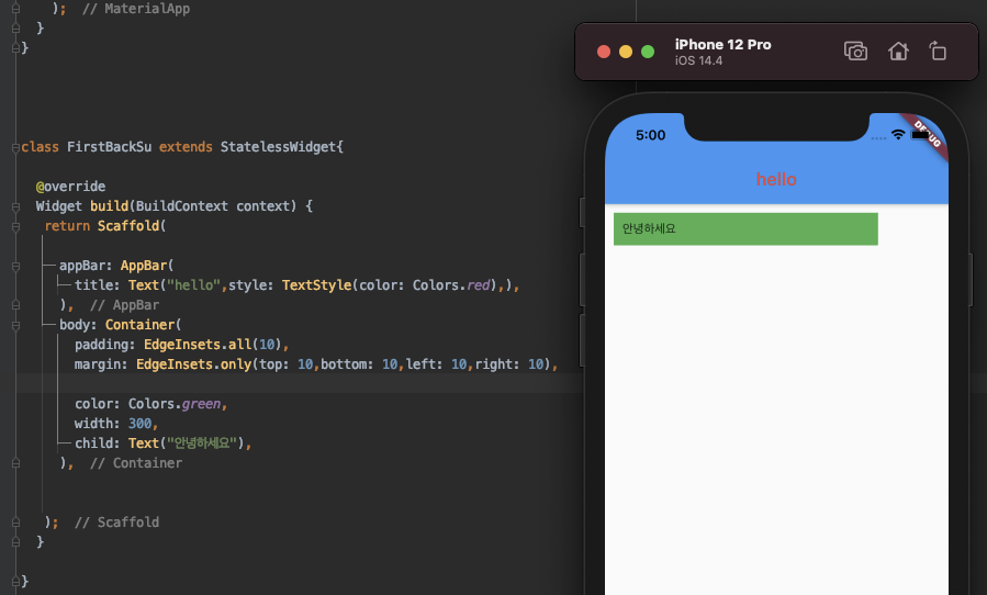 1회차 세부 과정 목차 더보기 1.Flutter new project 옵션 선택 2.파일 구조와 역할 설명 3.주석 4.안드로이드 시뮬레이터 테스트 앱띄우기 5.핫리로드 6.IOS 시뮬레이터 테스트 앱띄우기 7.머티리얼앱 과