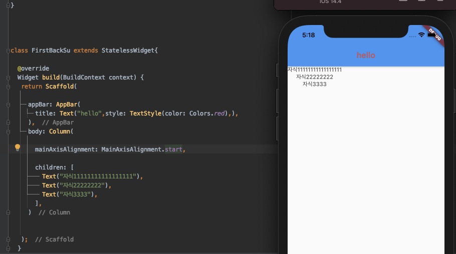 mainAxisAlignment 옵션은 MainAxisAlignment 라는 것을 씁니다. 거기에 start로 줘봤습니다.