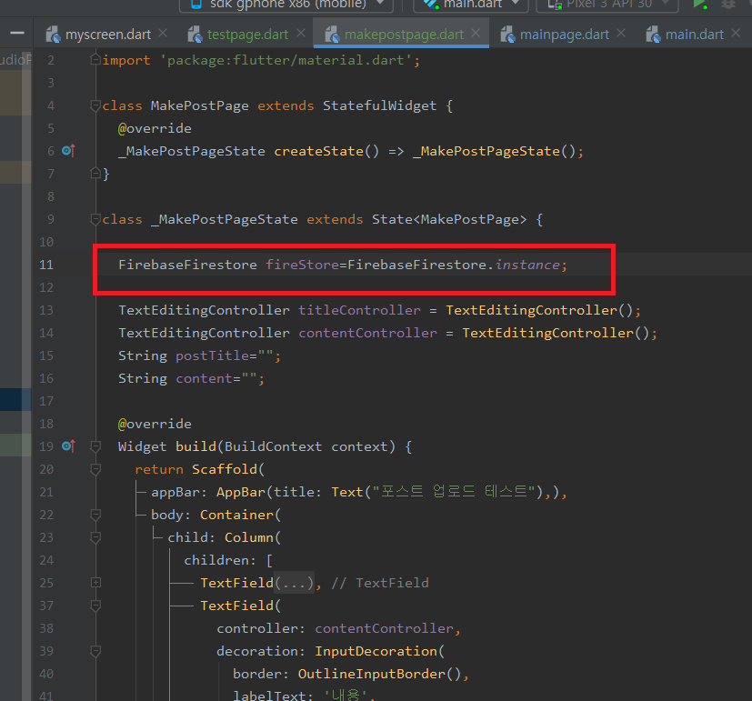 이렇게 만들었으면 글을 입력할수있는 위젯인 TextField 라는 위젯을 만들어 볼게요.
