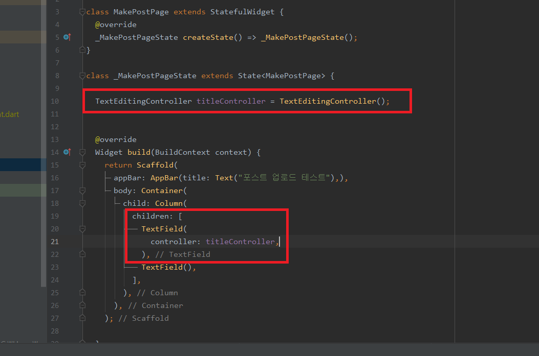 그다음 TextField 의 controller 옵션에 넣어줬어요.