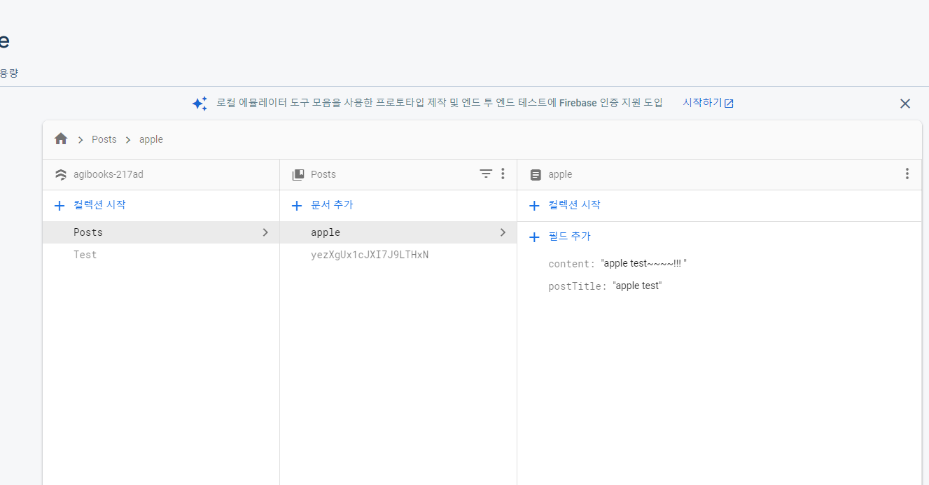 그랬더니 파이어스토어를 여니까 문서이름이 apple 인게 생성이되네요.