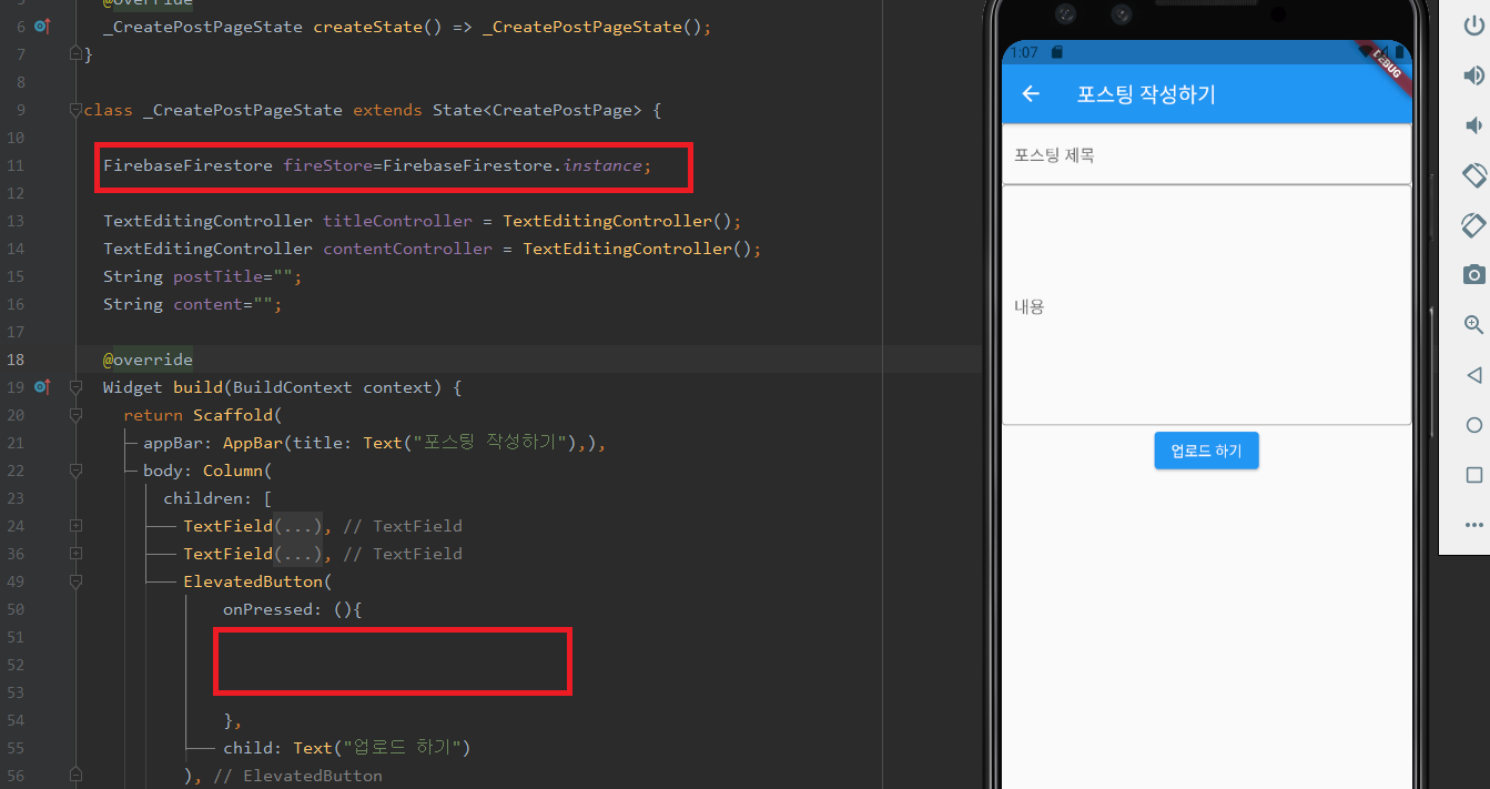 그다음 사진 윗부분의 빨강테두리 부분에 FirebaseFirestore fireStore=FirebaseFirestore.instance; 이거 잘적어주시구요.
