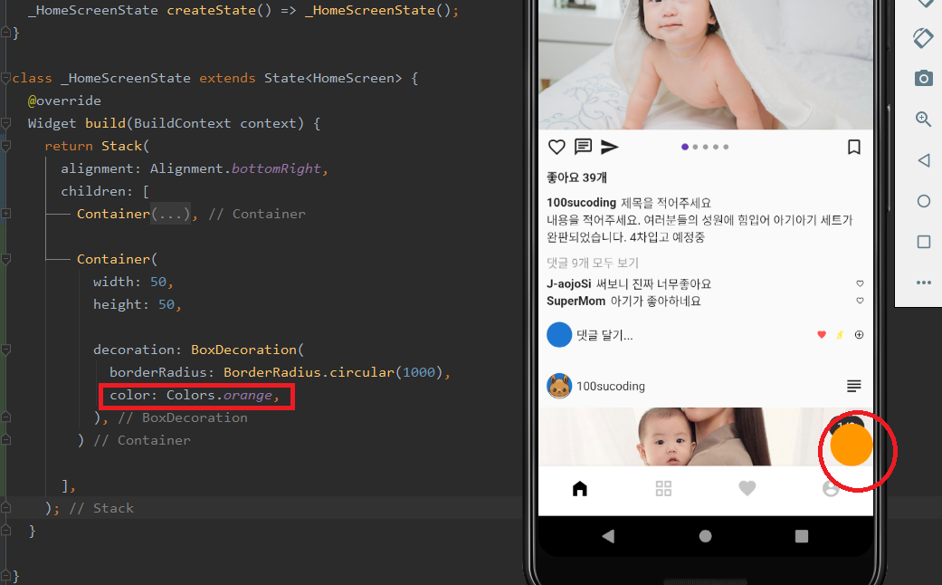 그리고 color 옵션을 BoxDecoration 내부의 옵션으로 옴겼어요.
