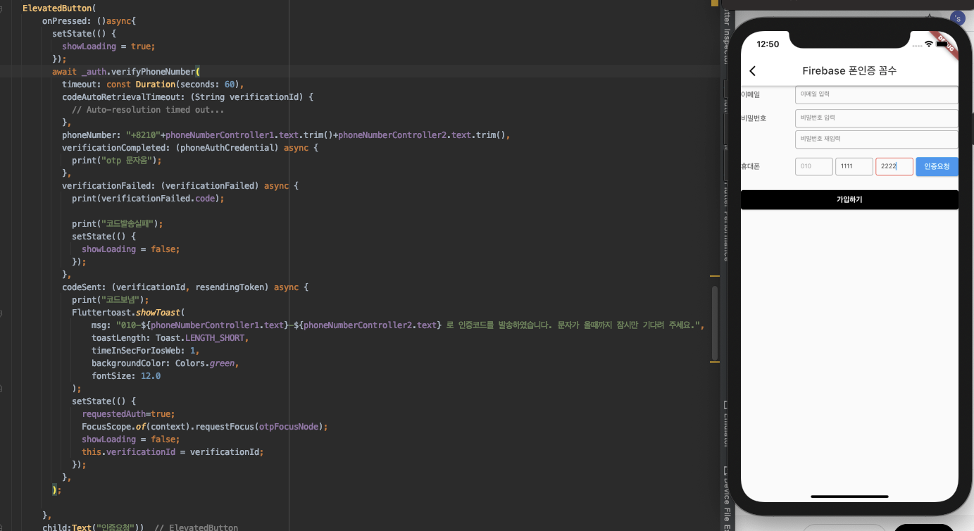 그리고 중요한 게 verificationId 가 만들어지는데 이값을 앱 내부의 verificationId 로 넣어요.