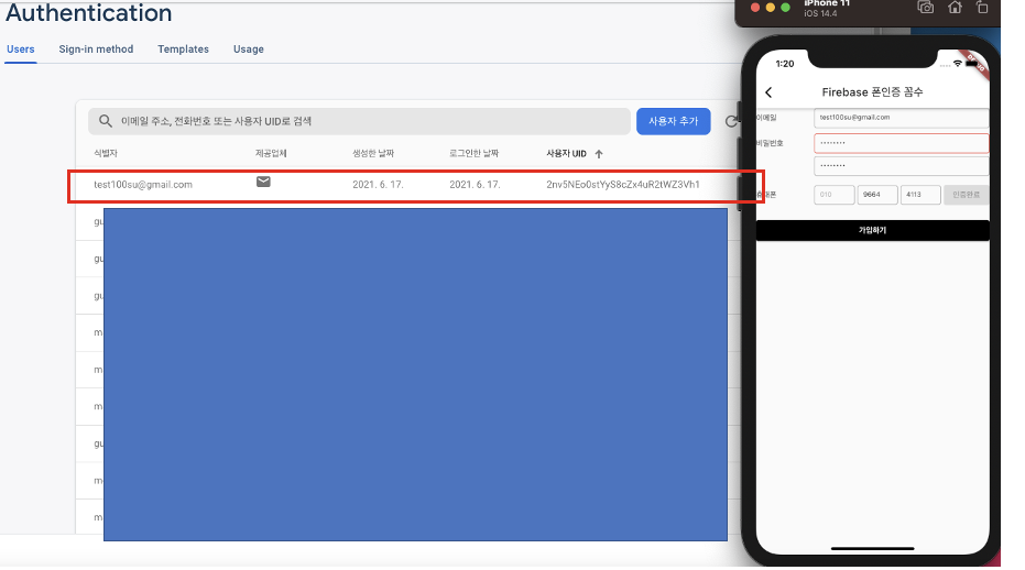 4. 인증 코드가 유효하면 Firebase PhoneAuth 에 가입이 된다. 즉 휴대폰이 유효함.
