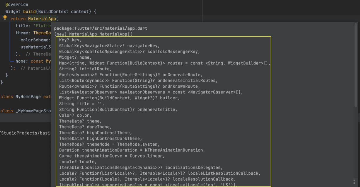 위에서 설명했듯이 우리가 수학시간에 함수를 쓸때 예를들어 2차방정식이라고 하면, 2개의 변수를 집어넣듯이 여기서 n개의 매개변수를 집어넣어서 MaterialApp 이라는 방정식을 완성시킨다고 보면 단순하게 이해하기 쉬울것 같네요.