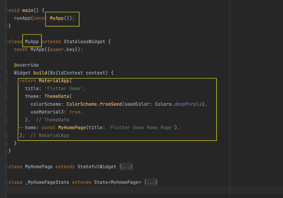 MyApp 이라는 MaterialApp 을 정의하는 부분과