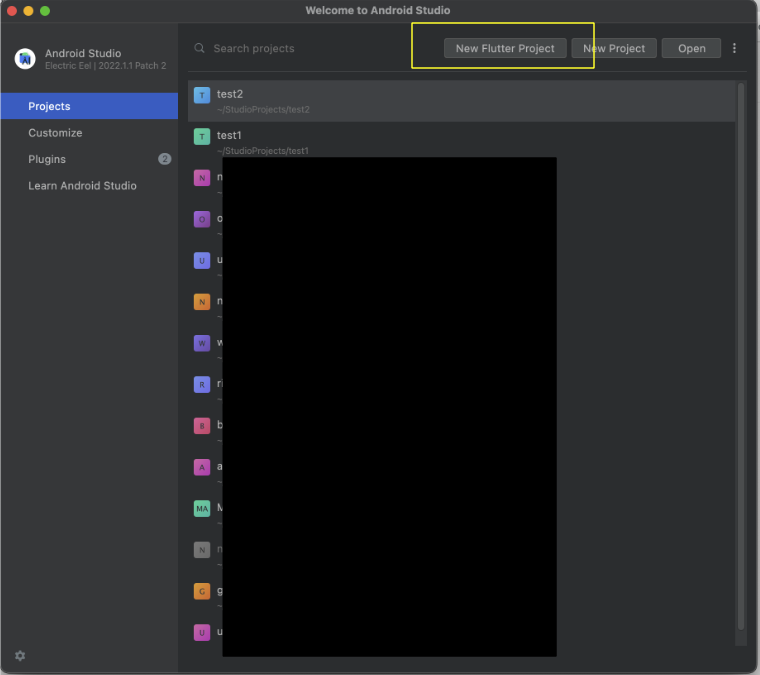 (아래 test2 test1 등등은 그동안 만들어두었던 프로젝트 목록들입니다. 개인 프로젝트 및 회사프로젝트가 있어서 가림처리함)