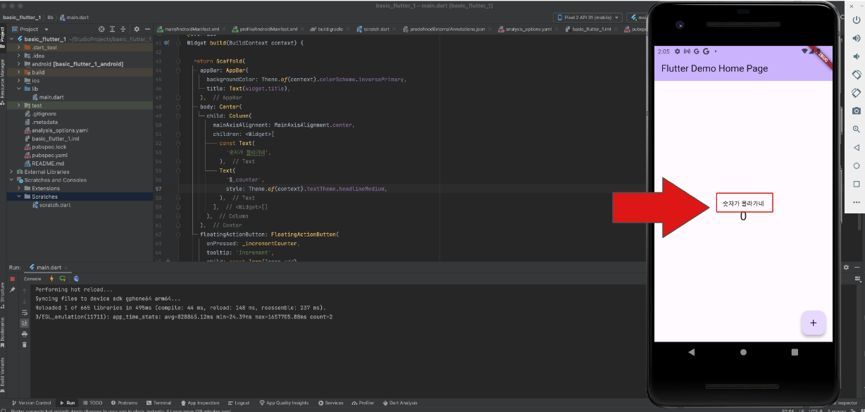 원래 내용이 바뀌면 메인함수를 다시 실행시켜야 되는데 flutter 에서는 hot reload 기능을 지원해서