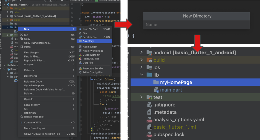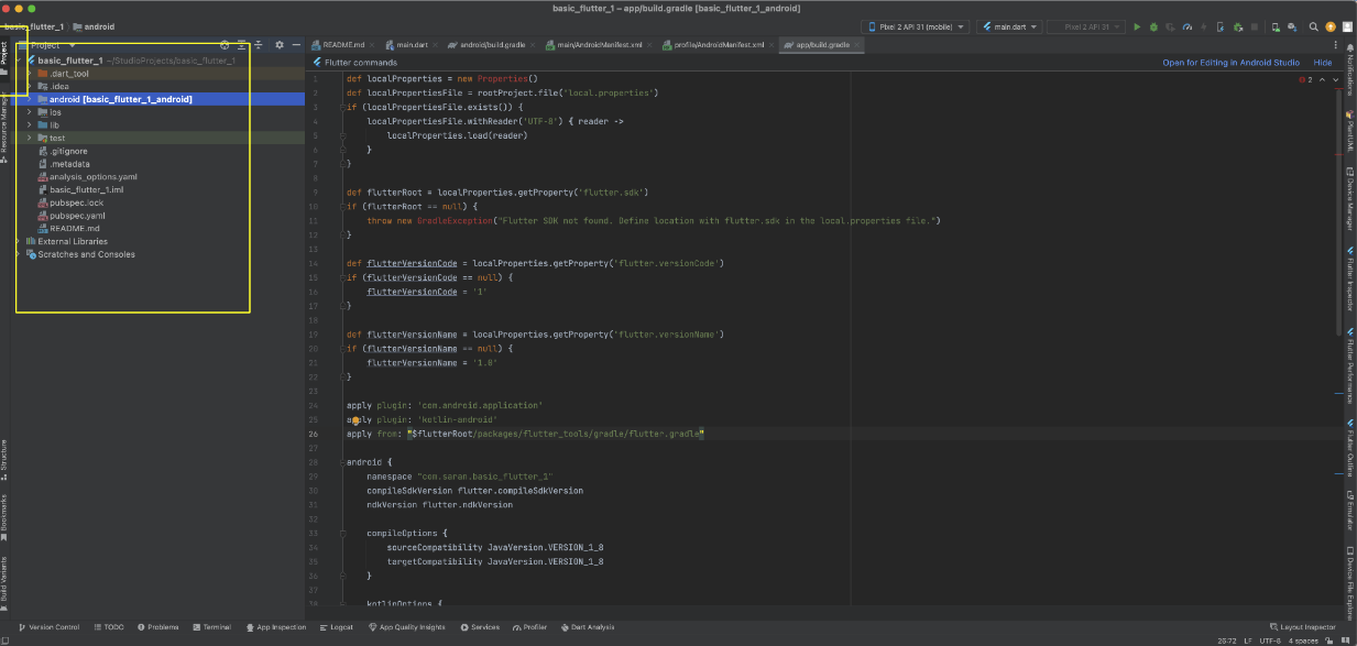 android 폴더 , ios 폴더 , lib 폴더 와 pubspeck.yaml 파일이 존재한다는걸 인식하도록 합시다.