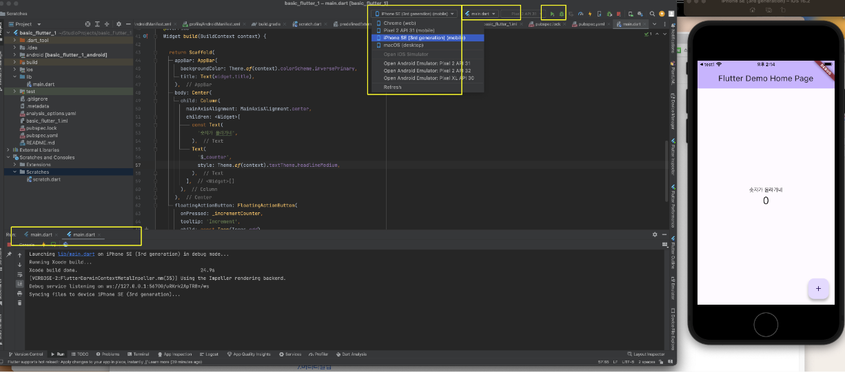 왼쪽 하단에 main.dart 파일이 탭으로 두개 떠있는걸 확인할수있습니다.