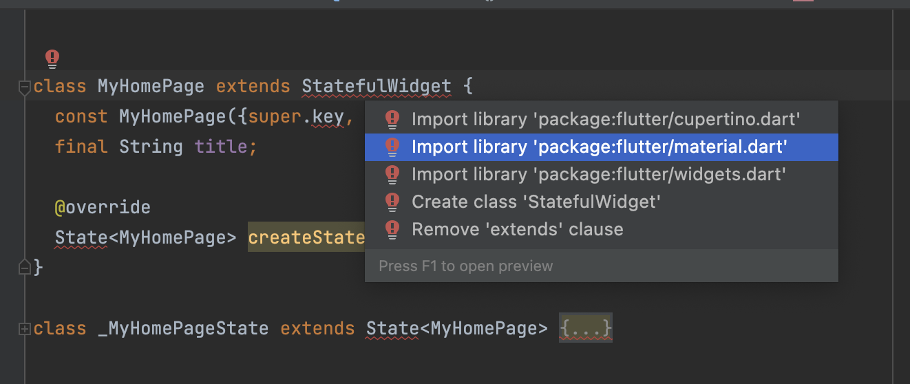 이때 빨간줄로 오류가 생기는데 StatfulWidget , State 등등은 플러터가 제공해주는 어떤 파일에 의존하고 있는데, 그파일을 못불러와서 생기는 오류입니다.