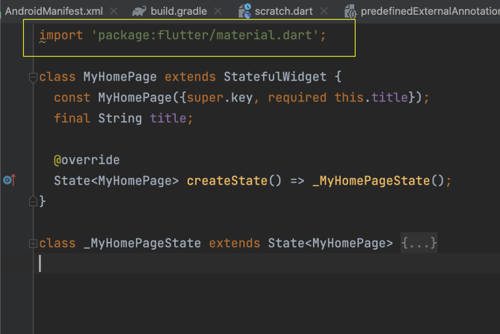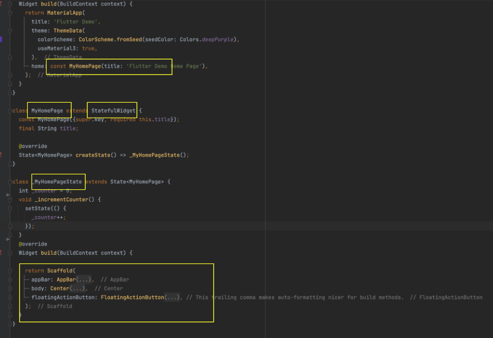 1. MyHomePage extend StatefulWidget 이라고 써져있네요. 아까는 StatelessWidget 이라고 써져있었는데.. 어쨋든 이것도 중용하지만 지금 다룰것은 아닌데 , Widgtet 이라고 적혀있는것 보니 이것이 위젯이구나 라는 직감이 살짝듭니다.