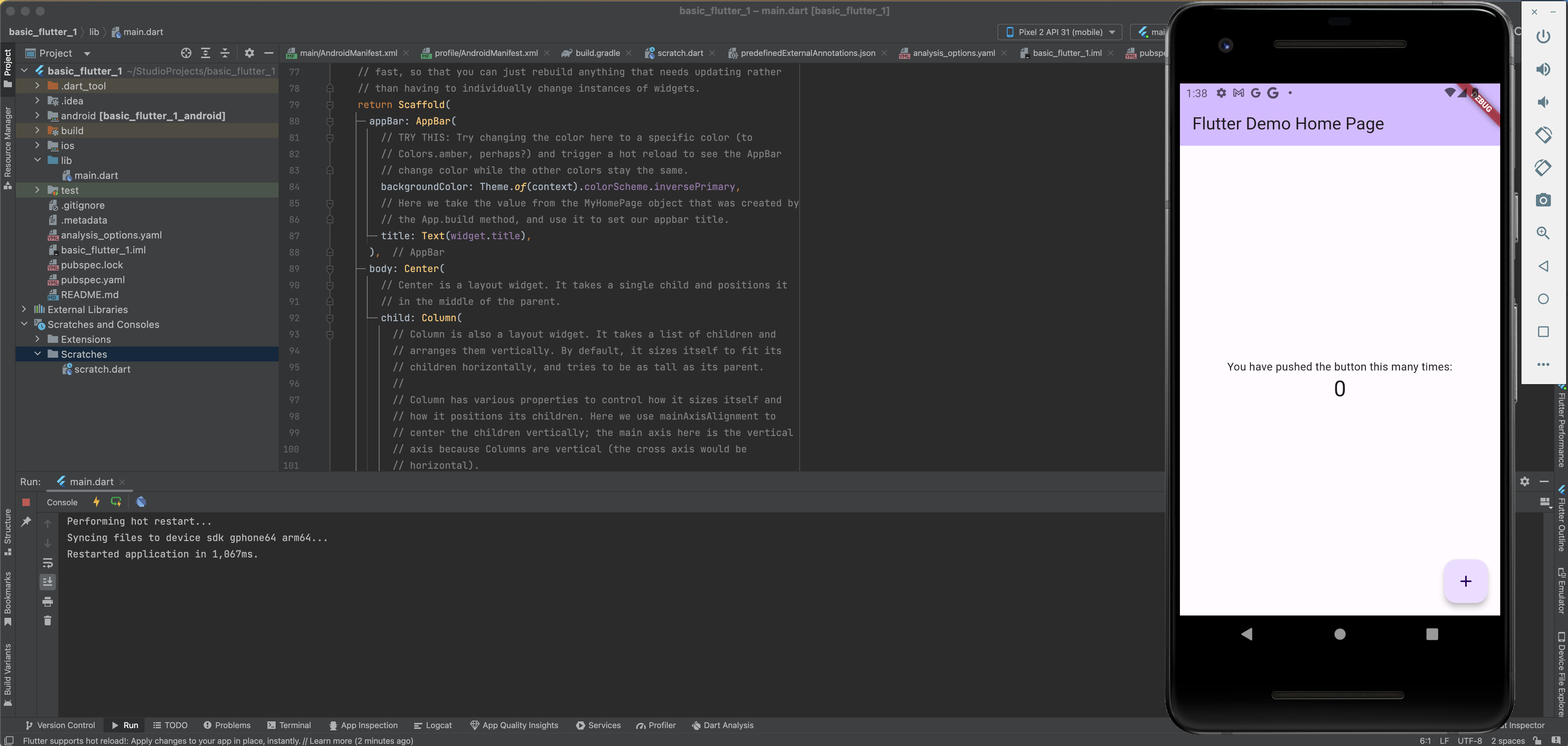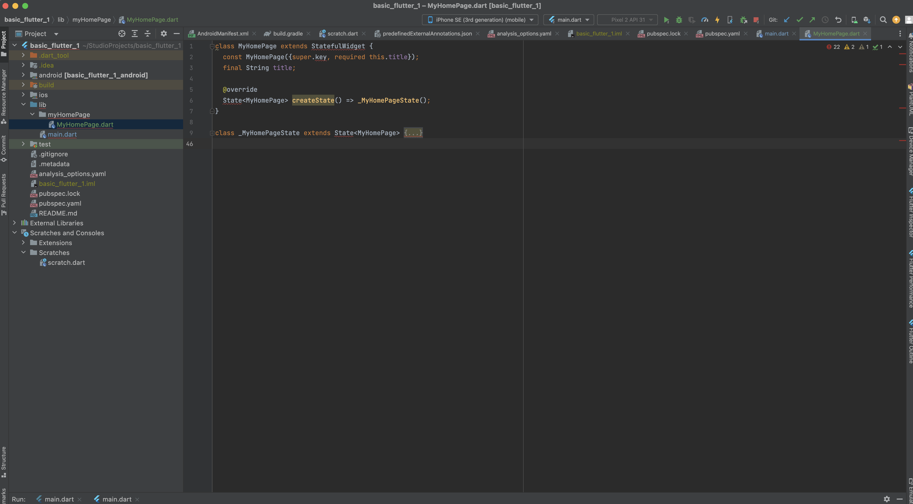 basic_flutter_1 이라는 패키지 ? 와 하부 폴더 같은게 보이고 하부 폴더 및 파일로 여러가지가 보입니다.