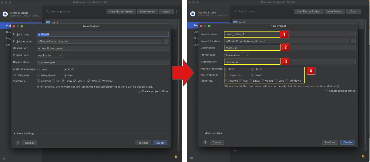 1.Flutter new project 옵션 선택