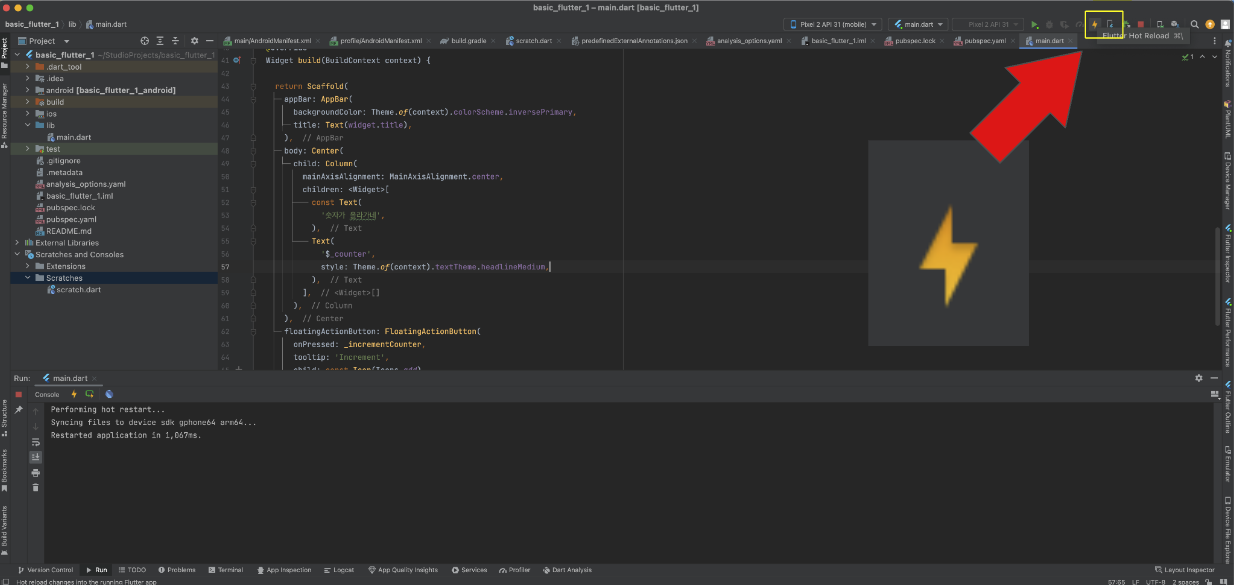 그리고 우측 상단에 번개모양을 눌러봅니다. 마우스를 가져다 대면 flutter hot reload 라고 설명도 나옵니다.