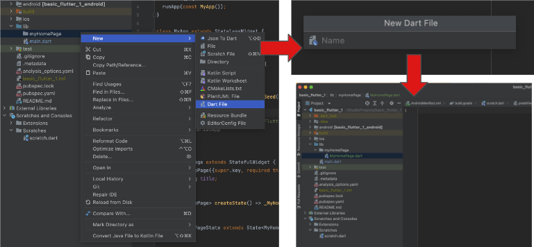 같은 방법으로 myHomePage 폴더에서 우츨 클릭하여 New -> Dart file을 선택해줍니다.