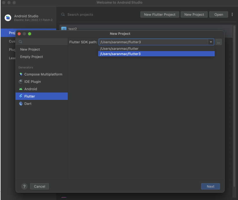 새로만들 프로젝트의 Flutter SDK path 를 선택합니다.