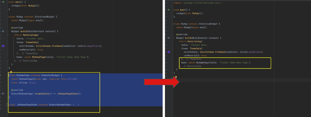 어쨌든 이렇게 파일을 만들었으면 내용을 적을것인데 아까 main.dart 에 있는 MyHomePage 의 내용을 가져올것입니다