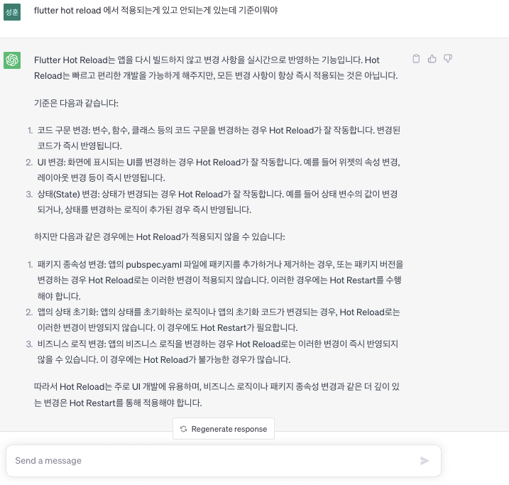 원래 내용이 바뀌면 메인함수를 다시 실행시켜야 되는데 flutter 에서는 hot reload 기능을 지원해서
