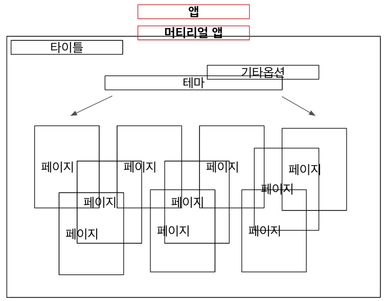 theme : 앱의 테마입니다. 모든페이지의 공통 기본 색상을 지정한다거나 , 전체 앱 프로젝트의 기본 폰트를 지정한다거나 할수있습니다.