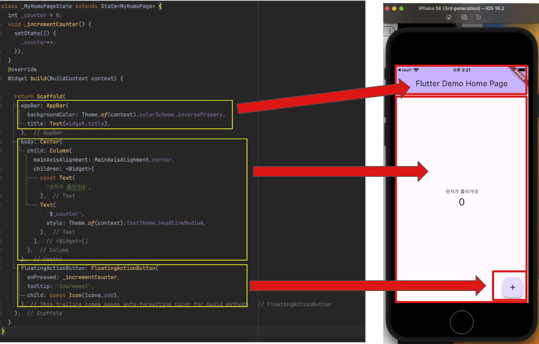 플러터에서 기본으로 제공하는 기본앱이 코딩되어 있습니다.