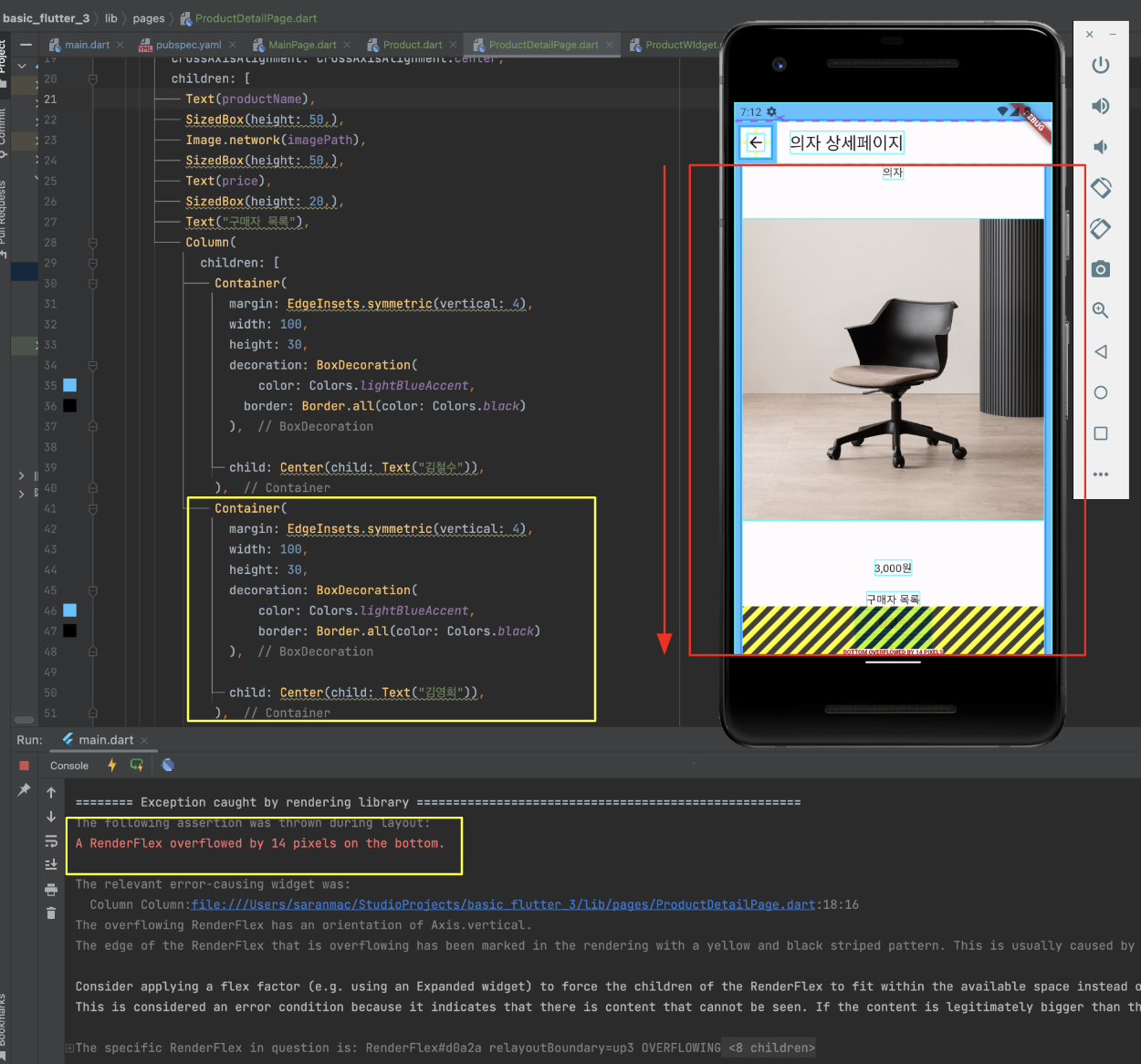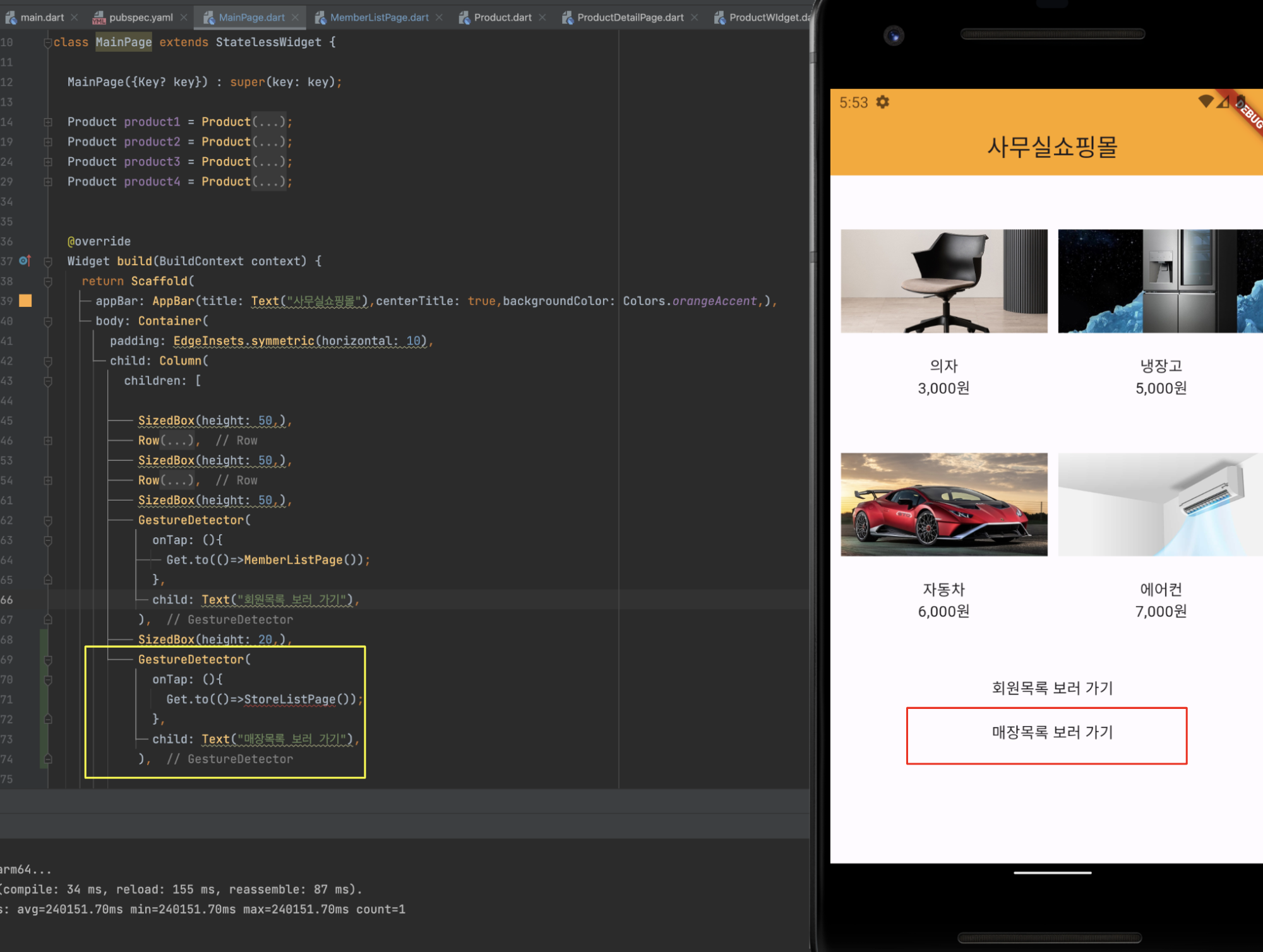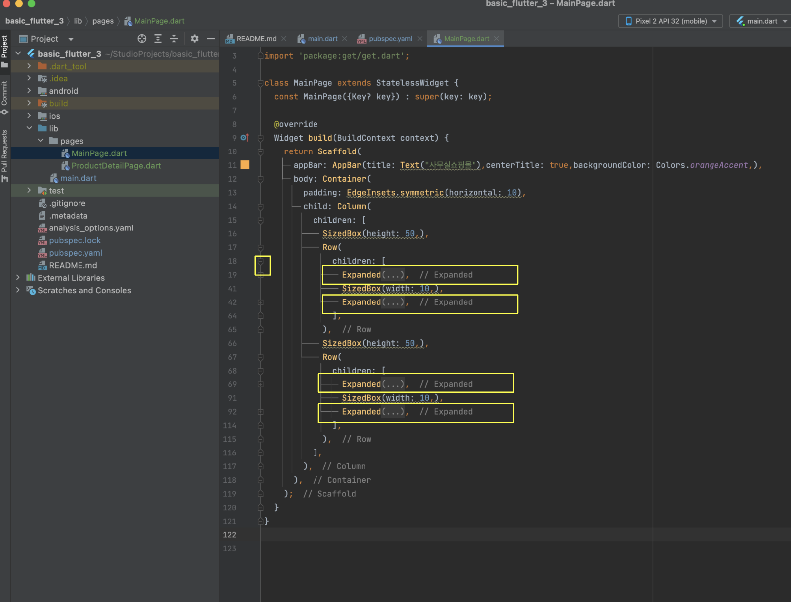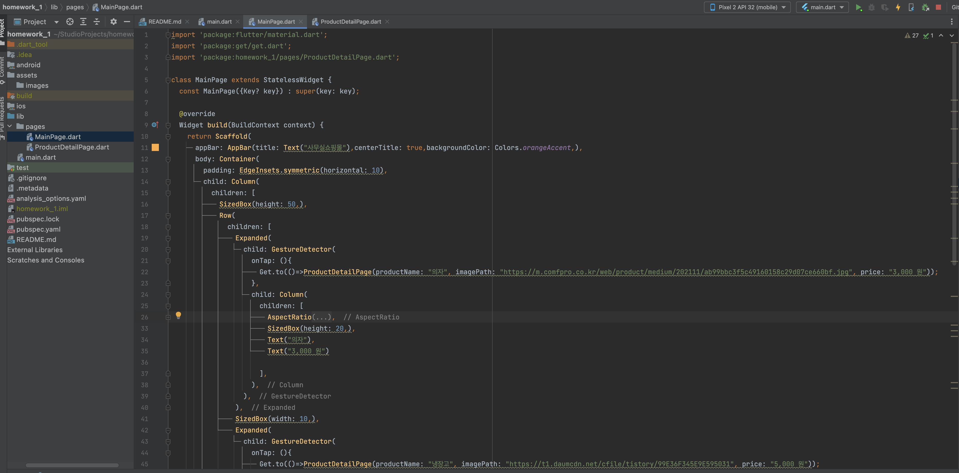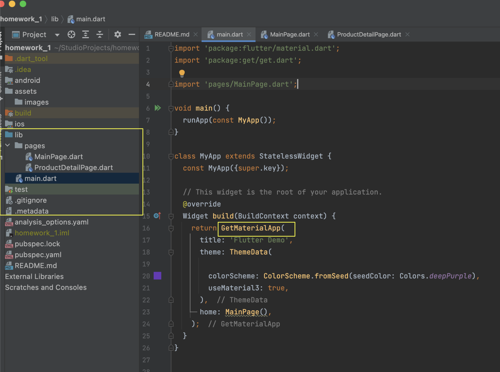 pages 폴더안에 MainPage.dart , ProductDetailPage.dat 파일이 있습니다.