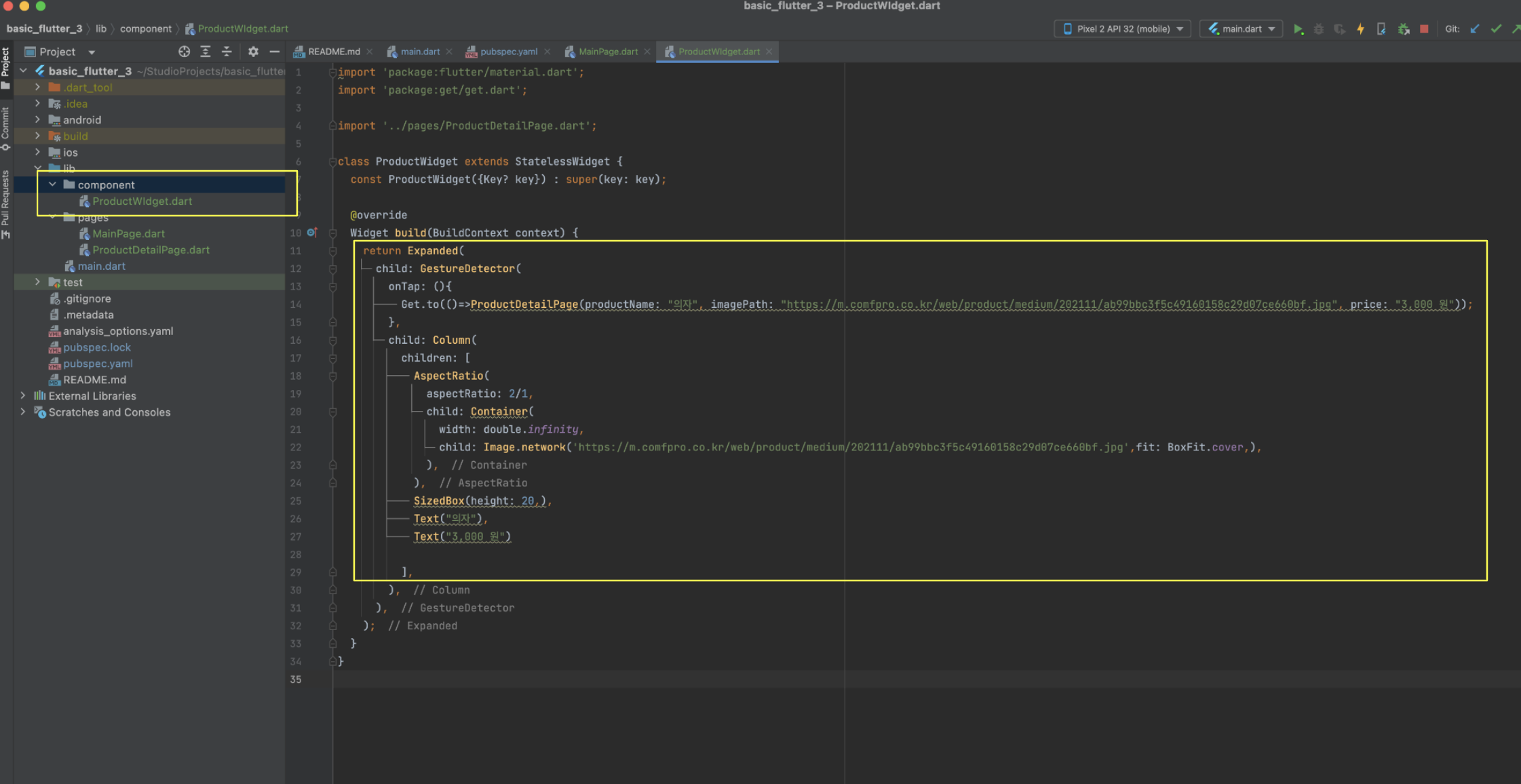 저는 lib -> component 디렉터리를 생성한후 다트파일 이름을 ProductWidget 이라고 지었습니다.