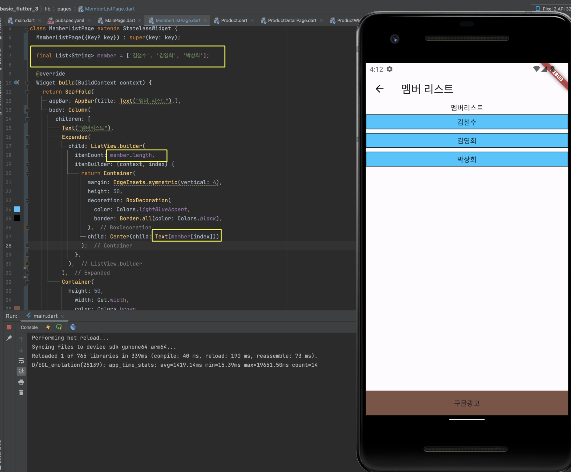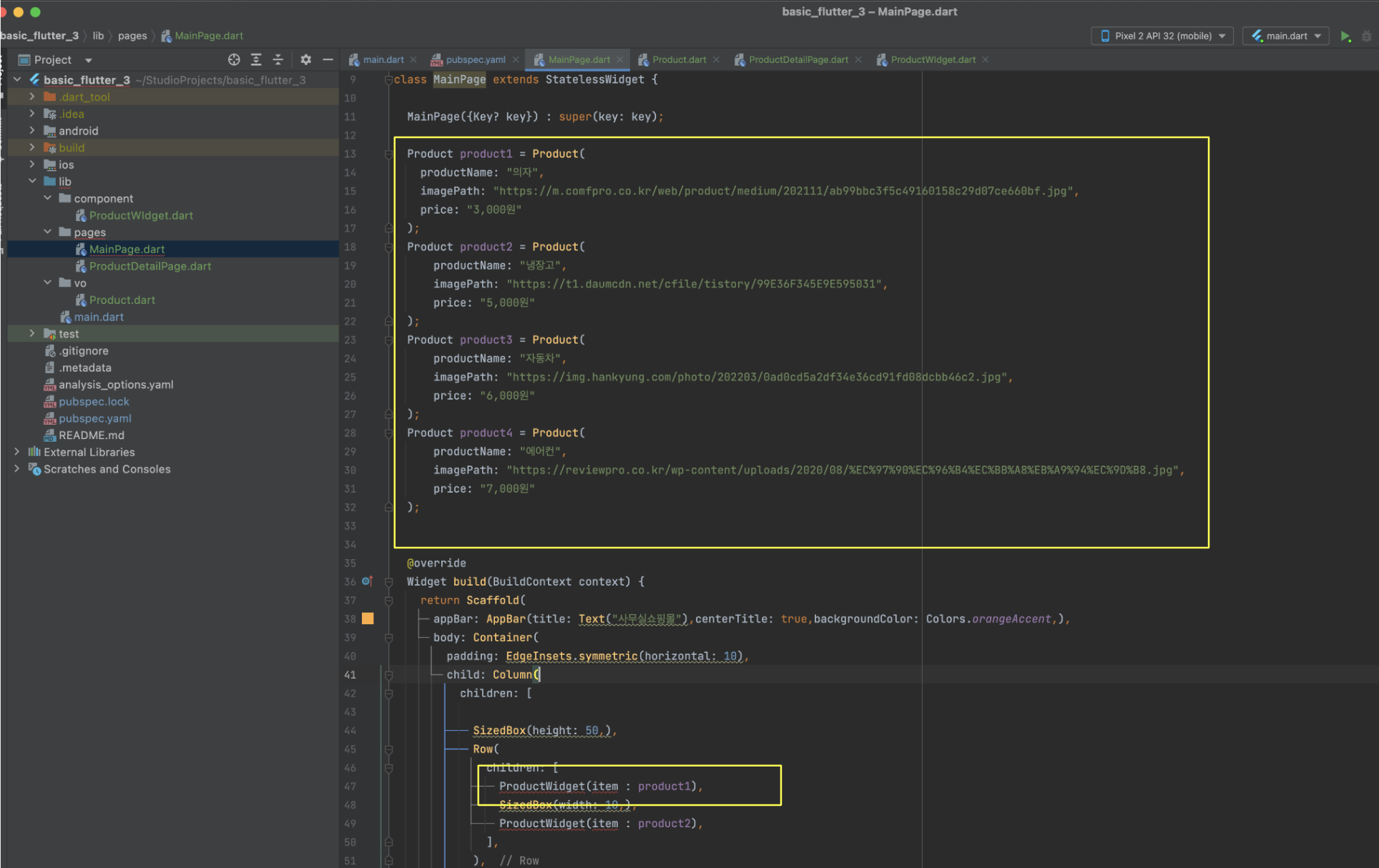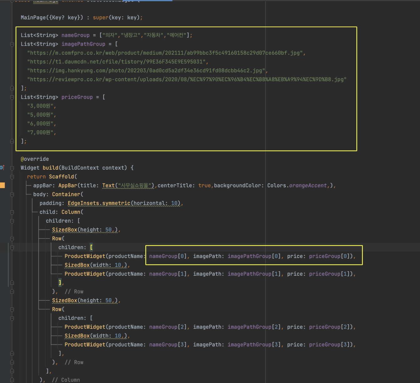 MainPage.dart 의 상품들의 리스트를 보여주기위해 적었던 코드를 보면 상품부분이 중복되는것을 볼수있습니다.