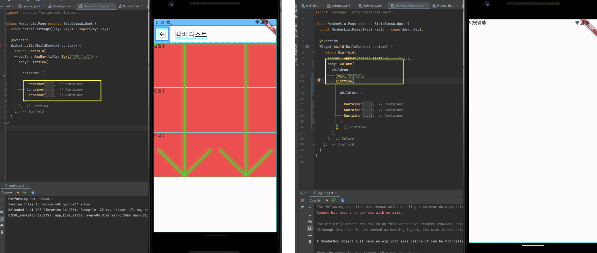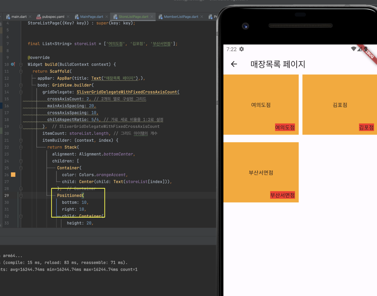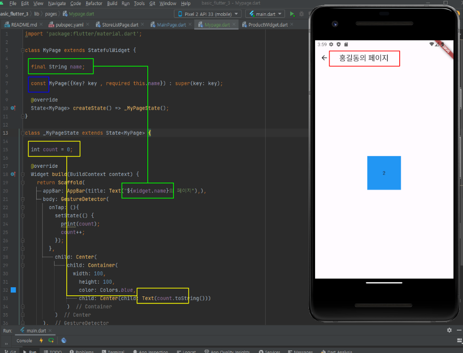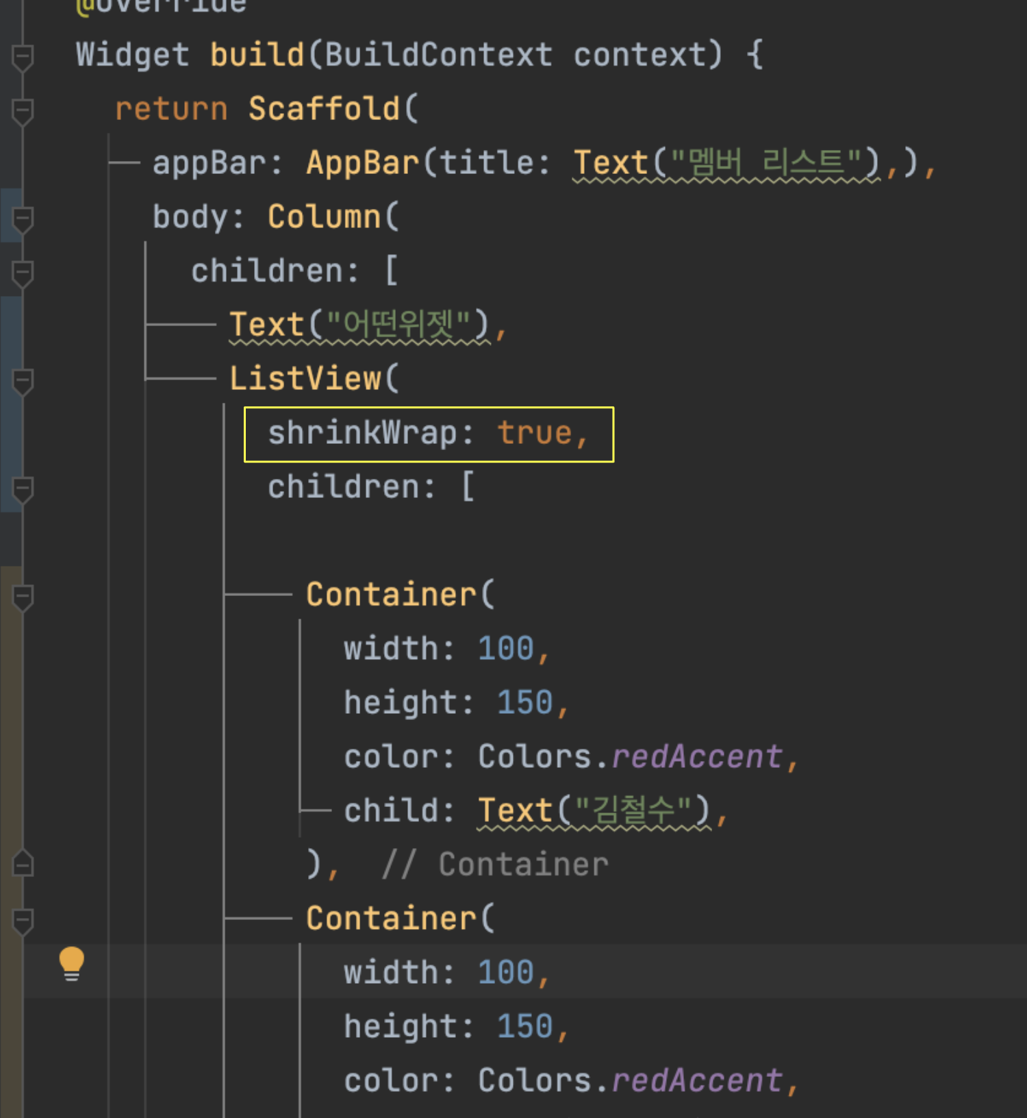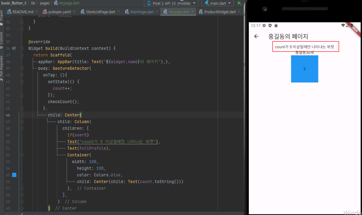 제일 아래 노란색 박스는 if(참이면) 바로 아래에 있는 위젯이 나오게하라 라는 뜻입니다.