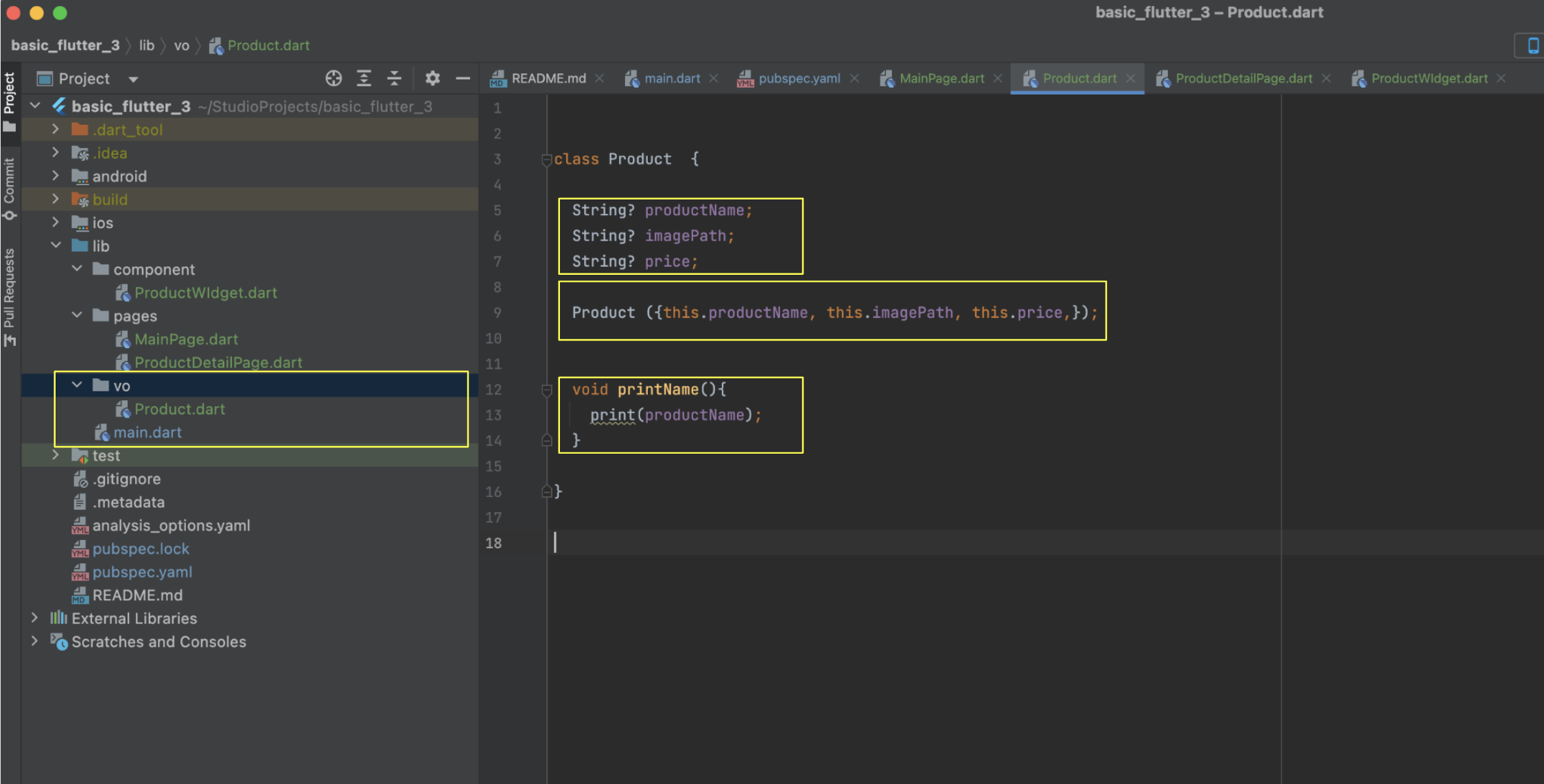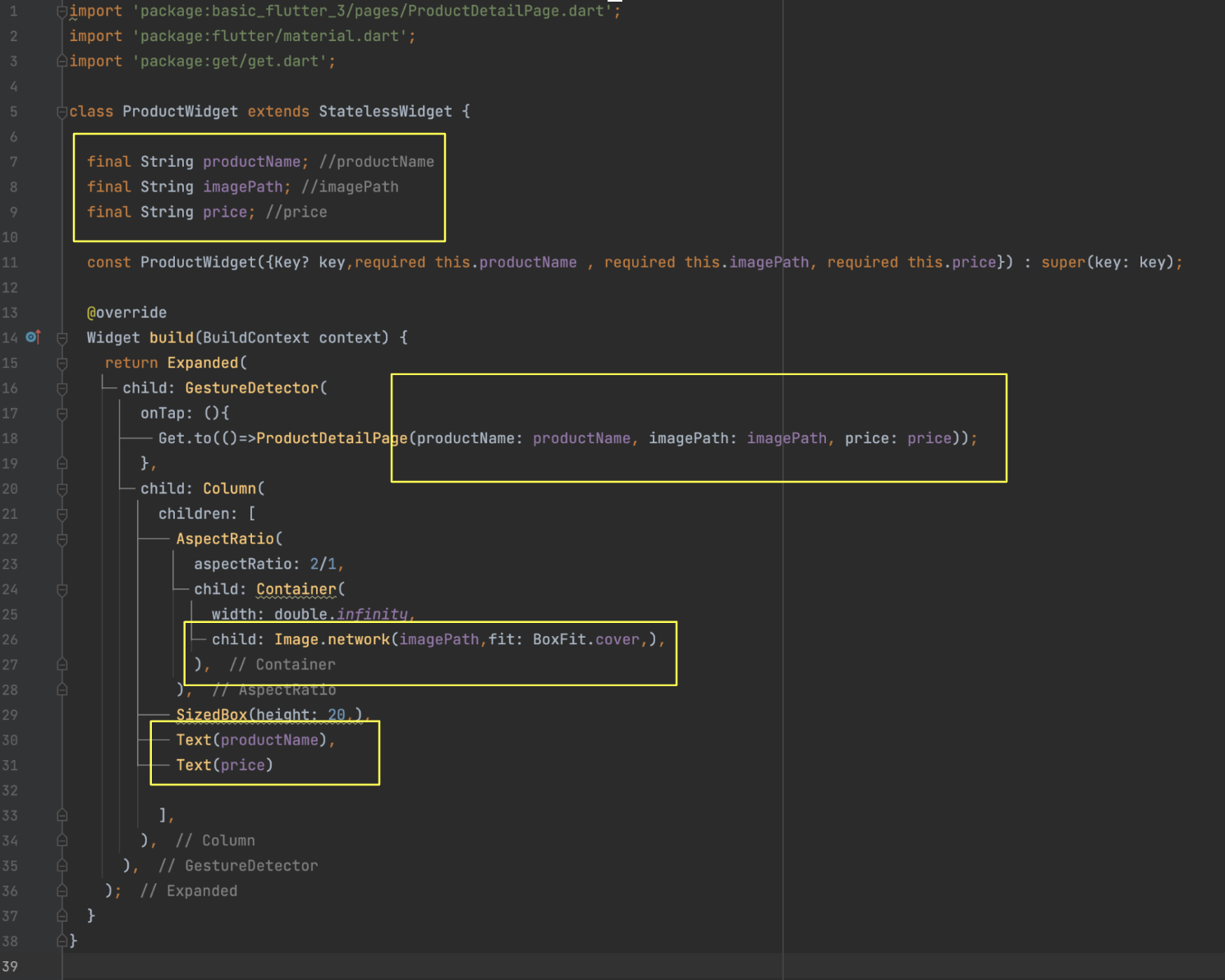 ProductWIdget 의 멤버변수로 productName , imagePath , price 를 지정하고 내부로직에서 사용하도록 적절히 써넣었습니다.
