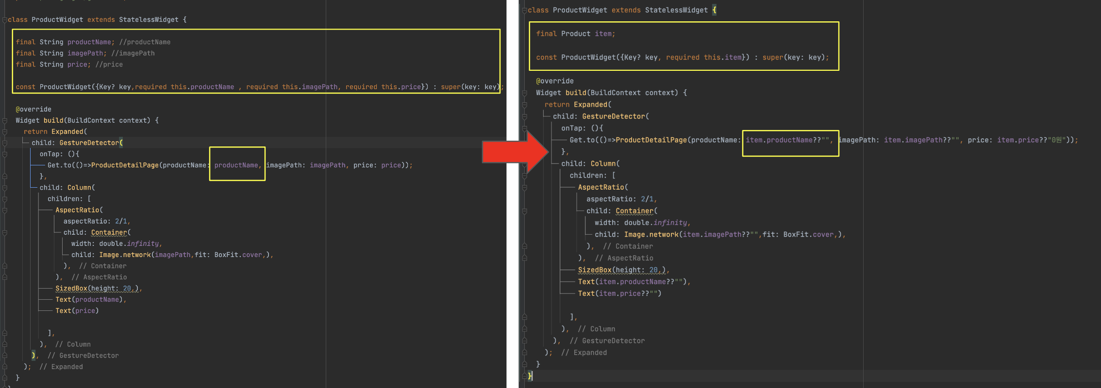 1. 중복되는 위젯이 많다. 그리고 중복되는 문자열도 많다. 숙제의 경우 상품목록이 4가지였는데 이 4가지가 안에 내용만 다를뿐 같은형태를 띄고있죠. 그리고 상품명, 이미지경로, 가격이 각 상품위젯만들때마다 2번씩 사용되었습니다. (화면에 표시되기위해 적은것 과 ProductDetailPage의 파라메터로 적은것)