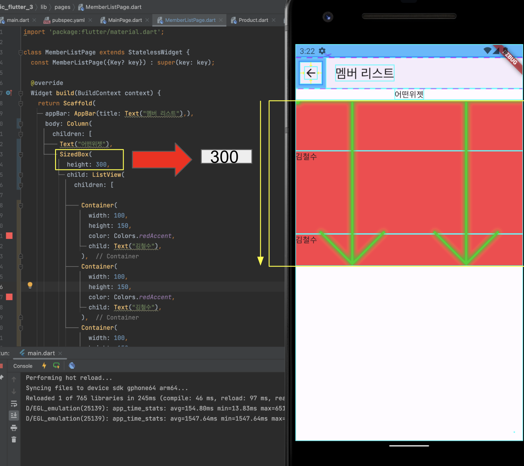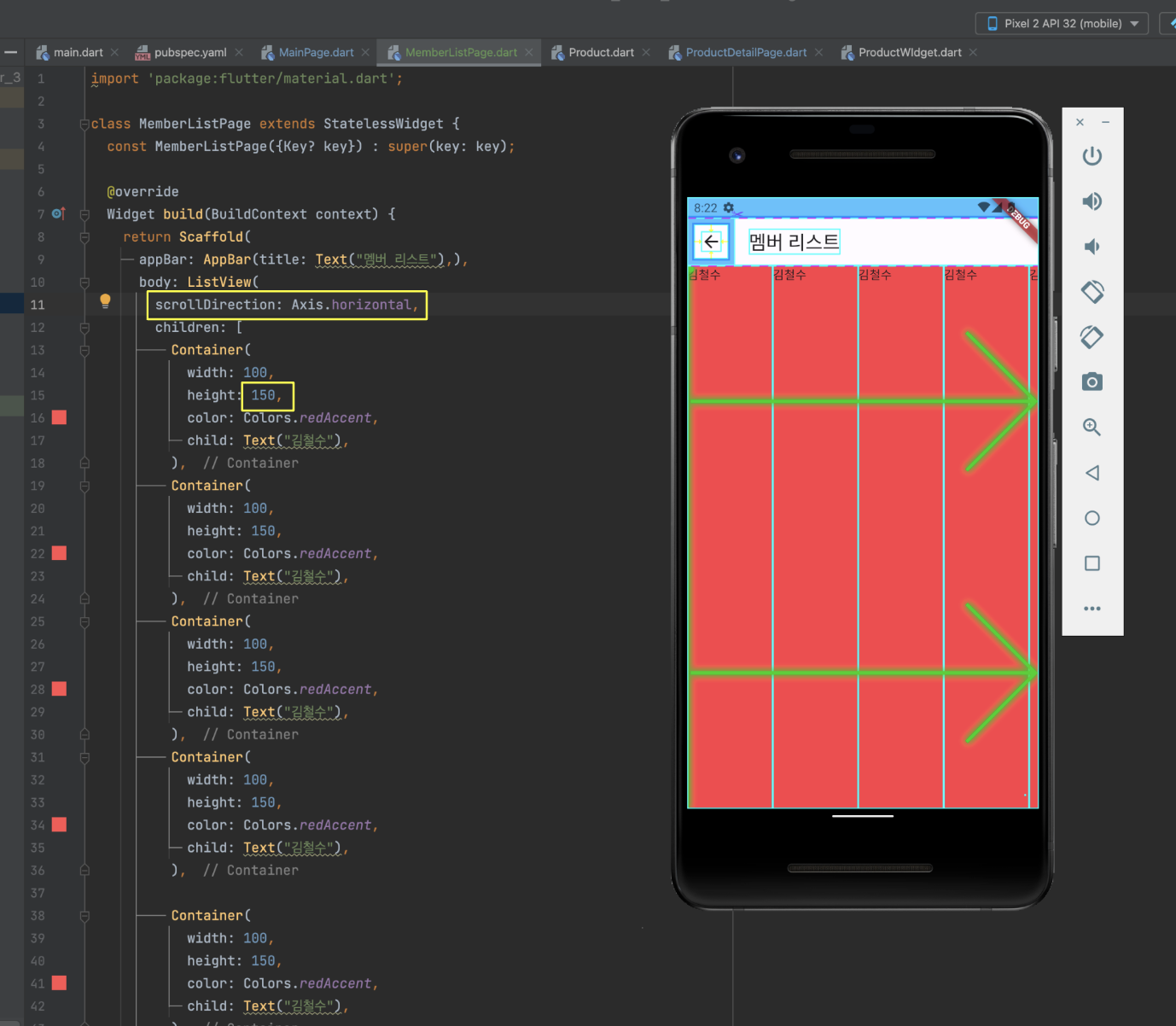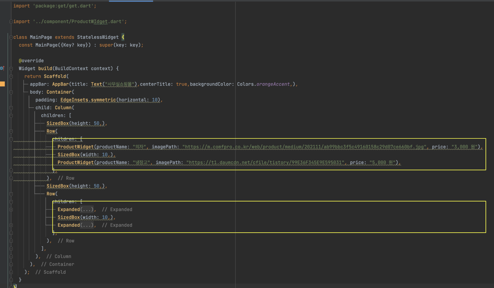 MainPage.dart 로 와서 Expanded 부분을 지우고 ProductWidget 을 대신 사용해줍니다.