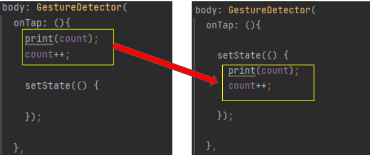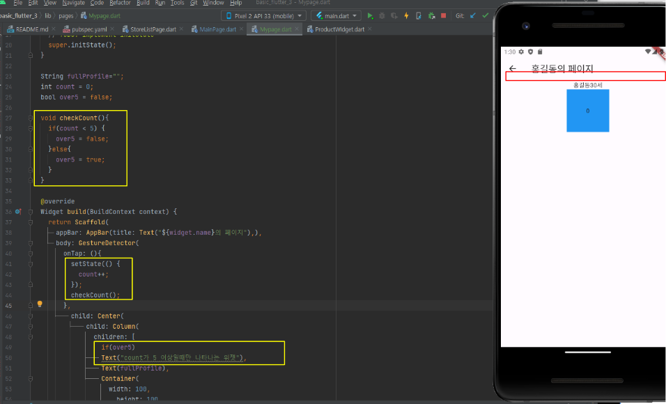 그리고 저기 파란색 Container 를 누르면 count 가 올라가고 checkCount 메소드를 호출하도록 했습니다.