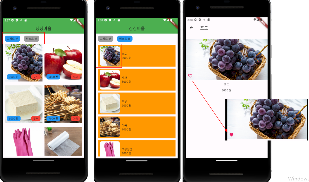 1. 그리드뷰와 리스트뷰 모드를 전환할수 있는 버튼을 만드세요. 그래서 각 모드에 맞게 뷰가 나오게 해주세요.