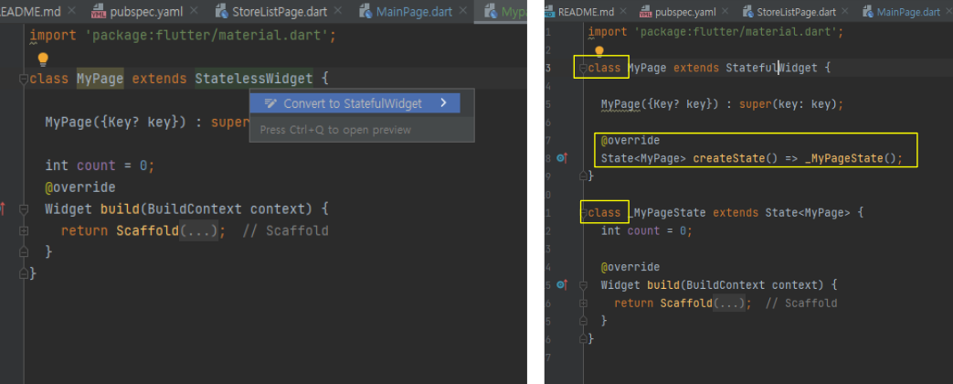 - build 메소드 내부의 랜더링되는 위젯의 조건문으로 나뉩니다.