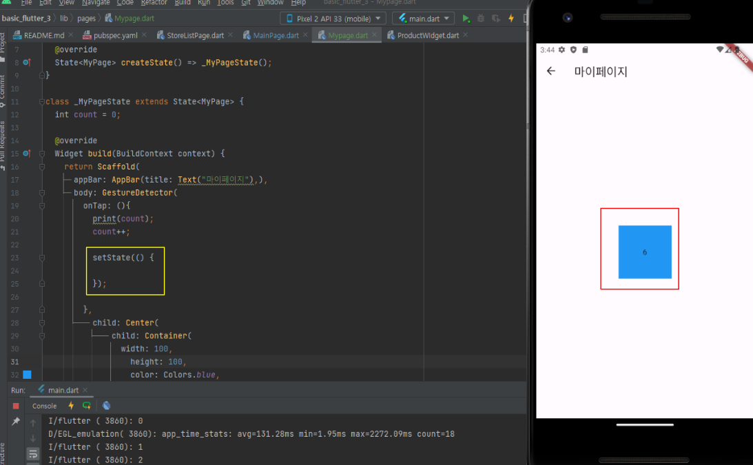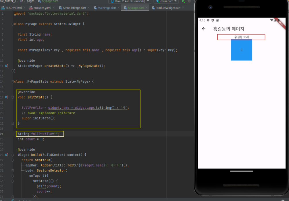 일단 지금 단계에서는 initState 와 setState 만 알고 넘어가도록 합시다.