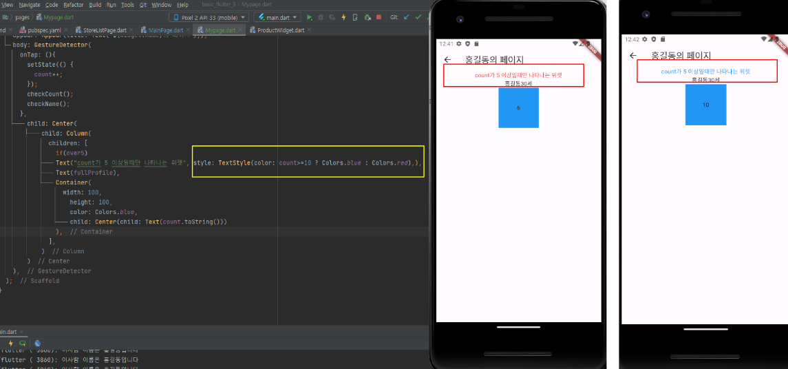 Text 위젯의 글자색상을 바꿔보았는데 count가 10이상이면 파랑색 , 그렇지 않다면 빨강색으로 나오게 했습니다.