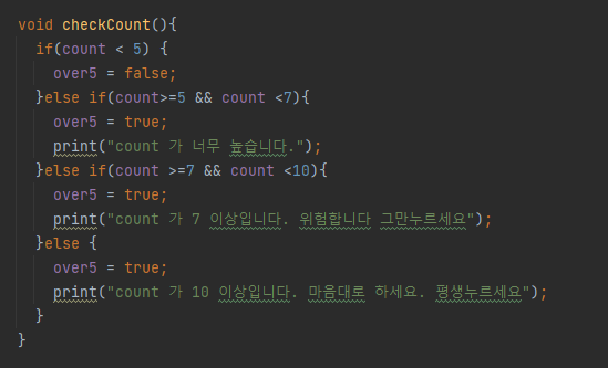count 가 5보다 작으면 over5 라는 bool 타입의 변수는 false 로 , 그렇지 않다면 true 로 값을 가지도록 해두었습니다.