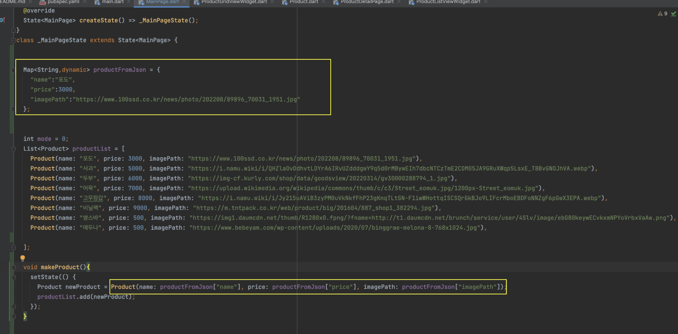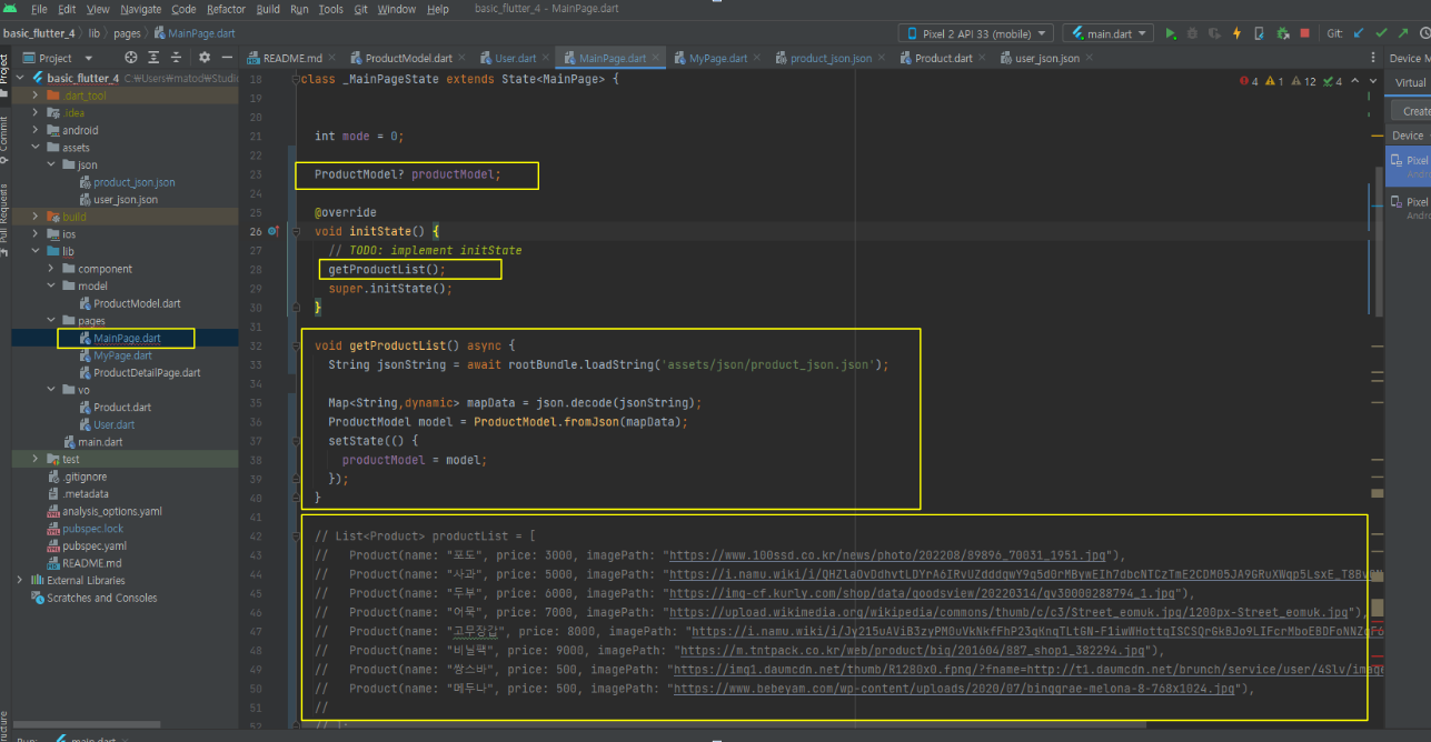 Product 타입으로 구성되어있는 productList 리스트 변수를 만들었습니다.