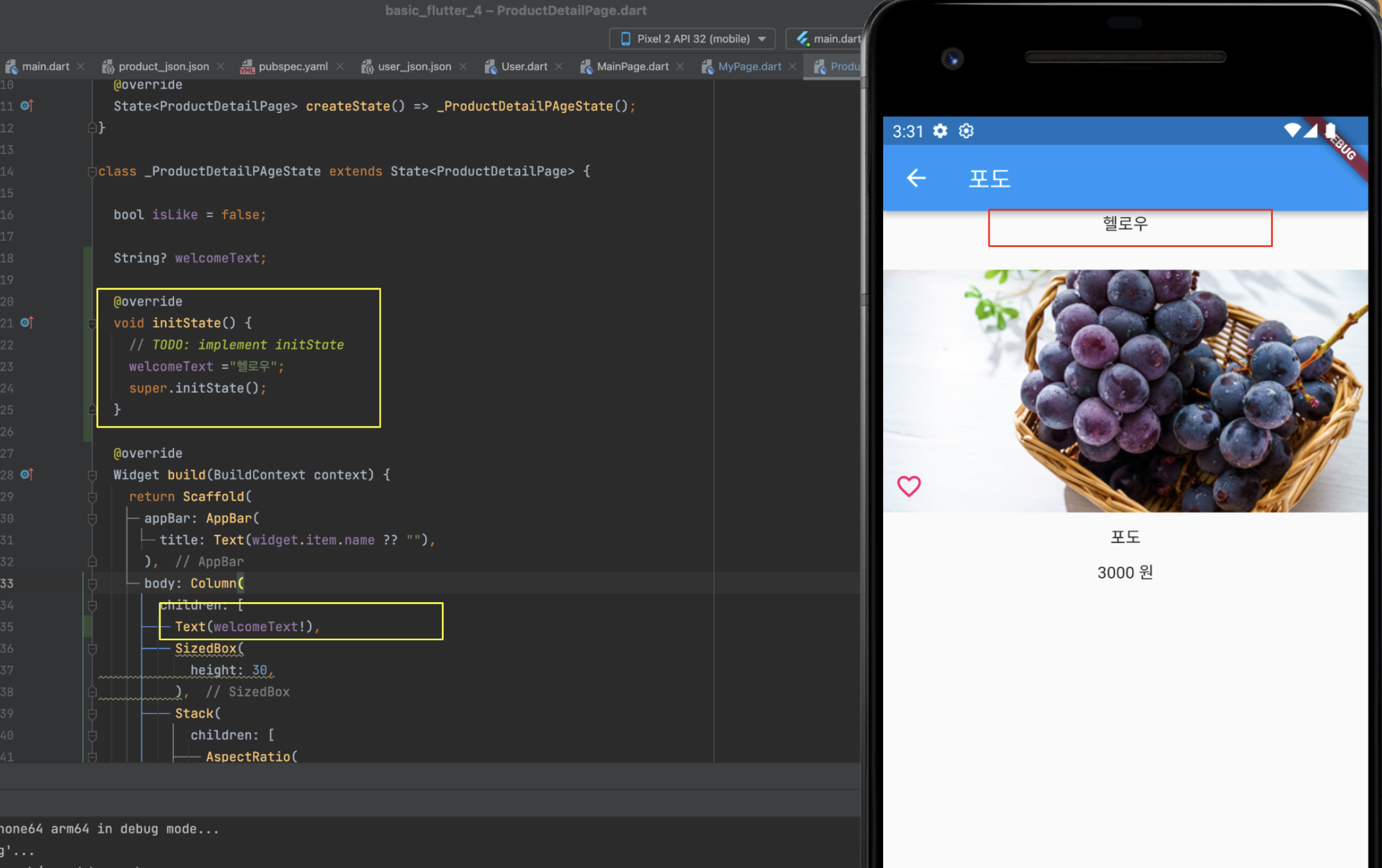 initState에서 welcomeText = "헬로우";
