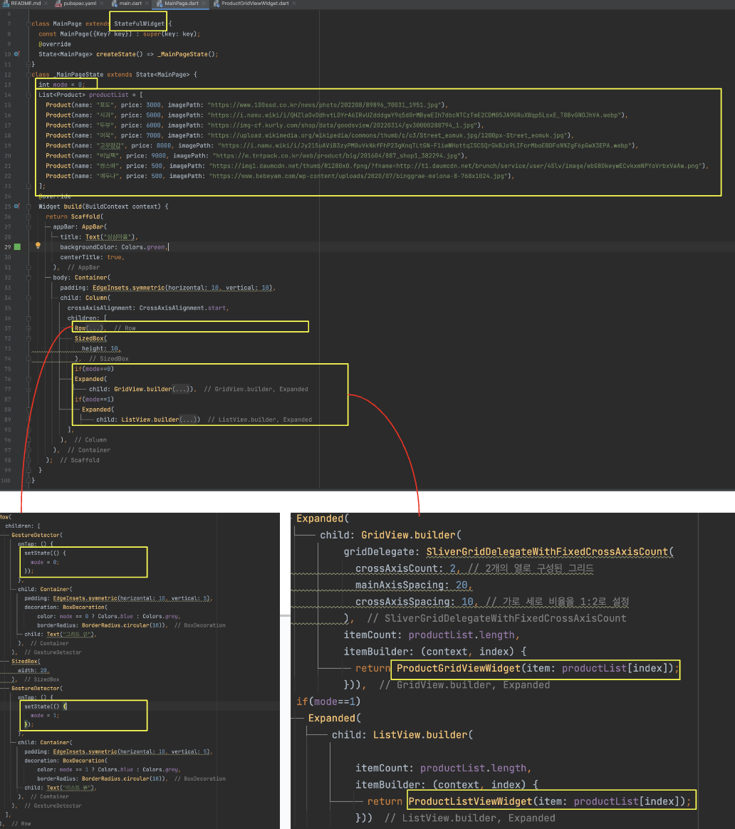 build 부분을 보면 Row위젯으로 리스트뷰,그리드뷰를 선택할수있게 버튼을 만들었습니다.